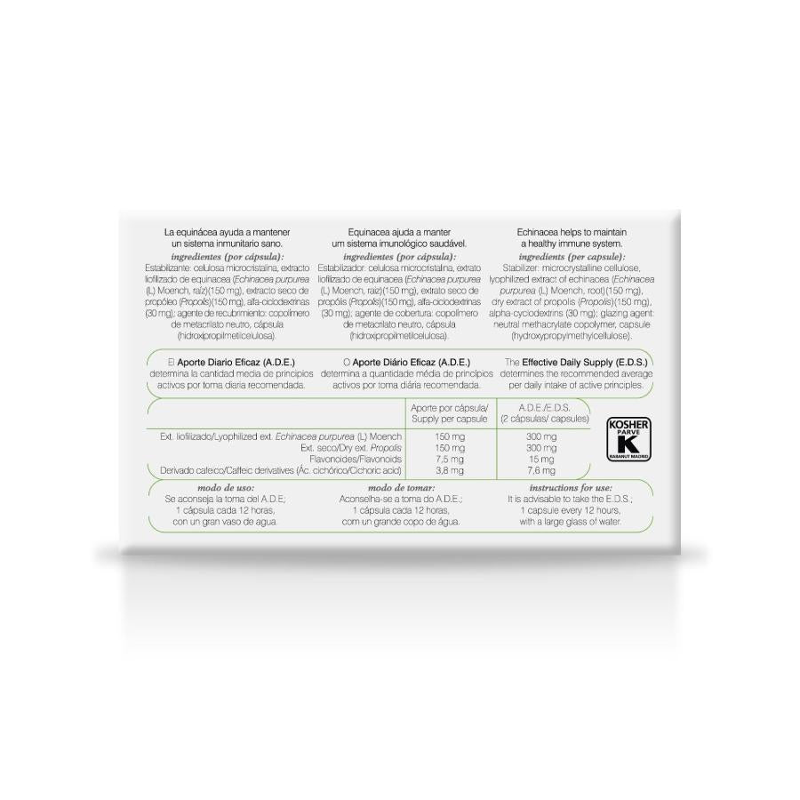 (por cápsula) Estabilizante: celulosa microcristalina, extracto seco de equinacea (Echinacea purpurea (L) Moench, raíz)(150 mg), extracto seco de propóleo (Propolis)(150 mg), alfa-ciclodextrina (30 mg); agente de recubrimiento: copolímero de metacrilato neutro, cápsula (hidroxipropilmetilcelulosa).