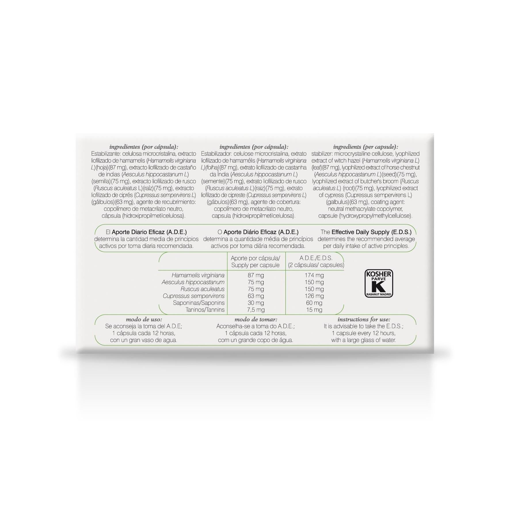 (por cápsula) Estabilizante: celulosa microcristalina, extracto liofilizado de hamamelis (Hamamelis virginiana L) (hoja)(87 mg), extracto liofilizado de castaño de indias (Aesculus hippocastanum L) (semilla)(75 mg), extracto liofilizado de rusco (Ruscus aculeatus L) (raíz)(75 mg), extracto liofilizado de ciprés (Cupressus sempervirens L) (gálbulos)(63 mg), agente de recubrimiento: copolímero de metacrilato neutro, cápsula (hidroxipropilmetilcelulosa).