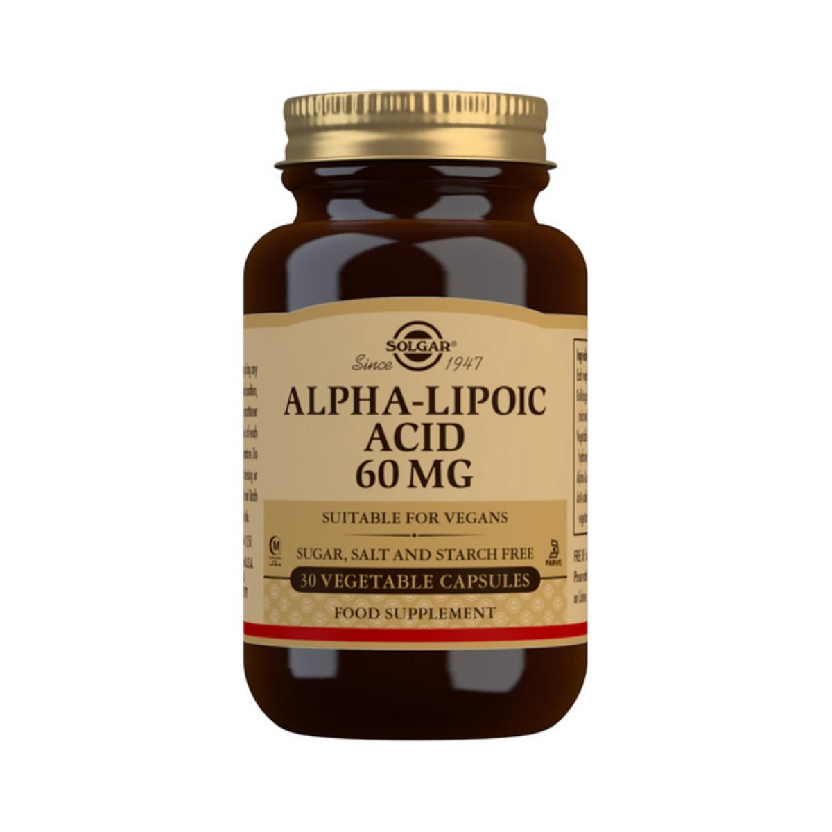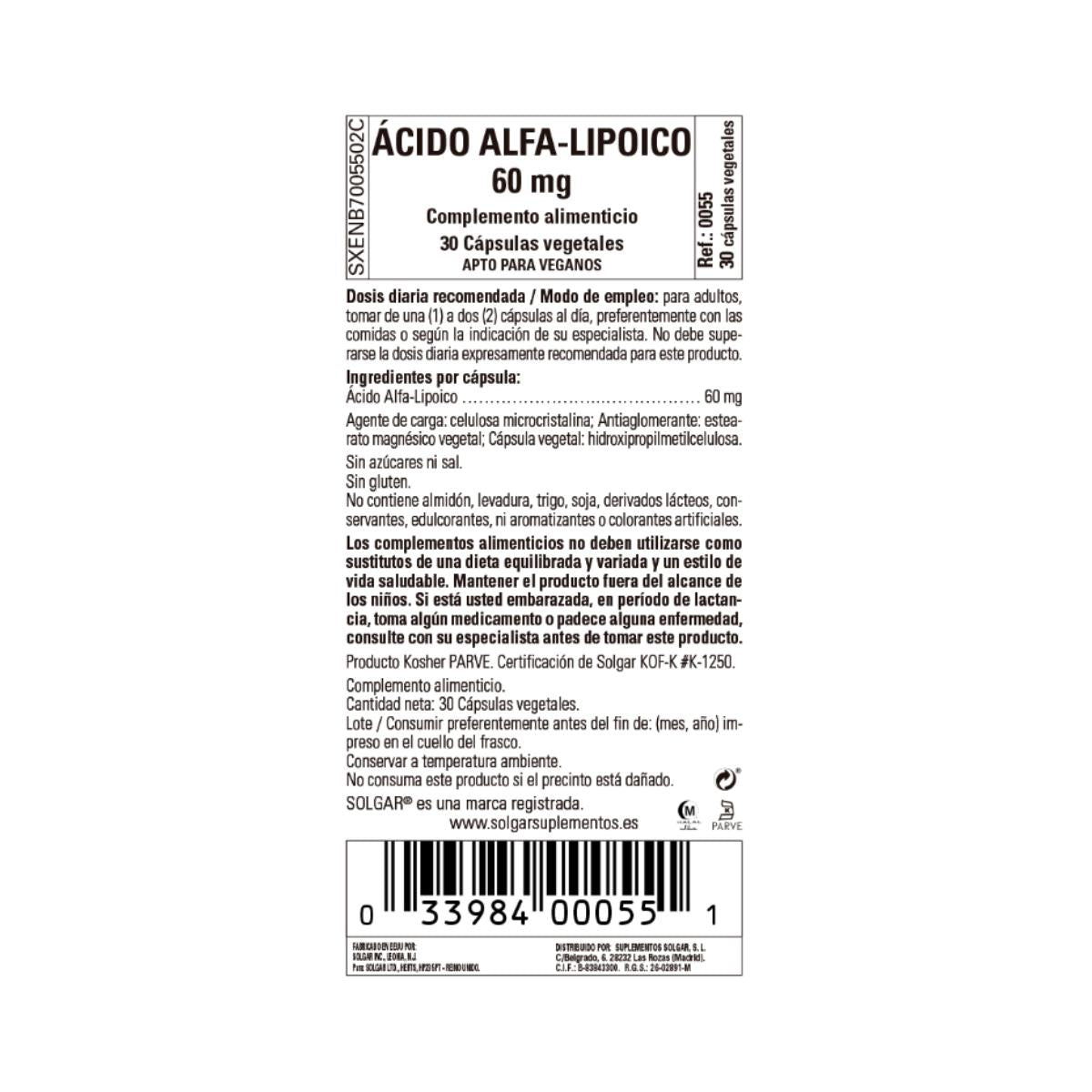 Solgar® Ácido Alfa-Lipoico Cápsulas vegetales de 60 mg . El ácido alfa lipoico se encuentra en las células y estructuralmente es un ácido graso. Es soluble en tejidos hidrofílicos y lipofílicos y algunas veces se utiliza junto con las vitaminas C y E.