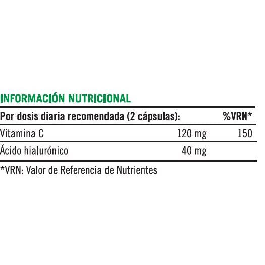 Agente de carga (harina de arroz), cubierta de la cápsula (gelatina (bovina)), vitamina C (ácido ascórbico), ácido hialurónico (como hialuronato sódico), antiaglomerantes (estearato magnésico vegetal, dióxido de silicio).