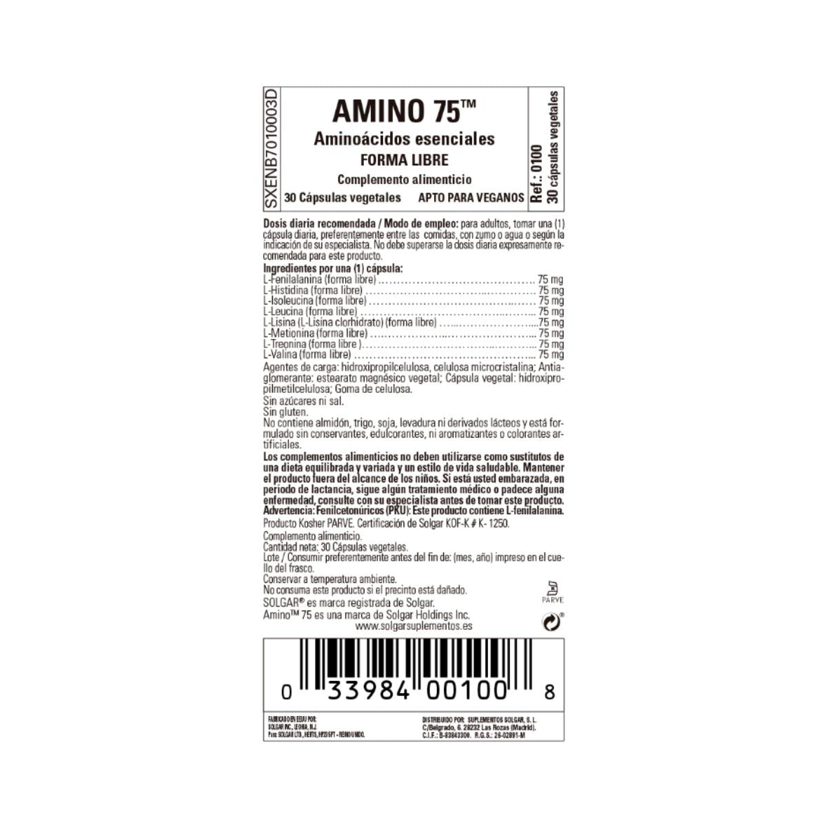 Solgar® Amino 75 Aminoácidos es una fórmula vegana que contiene aminoácidos esenciales