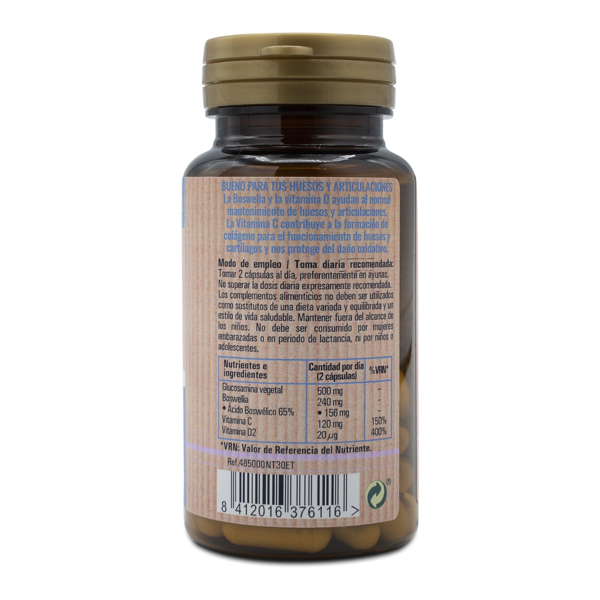 D-Glucosamina (Clorhidrato de Glucosamina): 250 mg, Agentes de Carga (Almidón de maíz y Celulosa), Boswellia extracto seco (65% Ac. Boswélico) (Boswellia serrata, resina): 120 mg, Vitamina C (Ácido Ascórbico): 60 mg, Antiaglomerantes (Silicato de Magnesio, Estearato de magnesio, Dióxido de silicio).