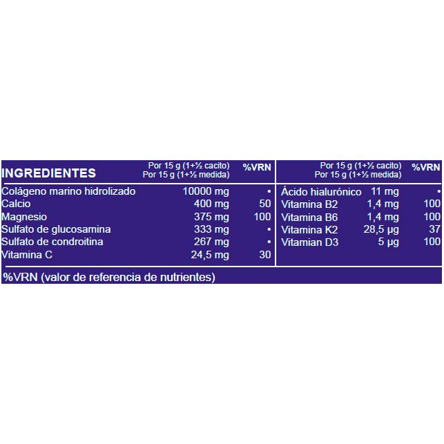 Colágeno marino hidrolizado (tipo I) [pescado], citrato de calcio, citrato de magnesio, sulfato de glucosamina, sulfato de condroitina, vitamina C, ácido hialurónico, vitamina B2, vitamina B6, vitamina K2, vitamina D3, acidulante (ácido cítrico), edulcorante (sucralosa) y aroma.
