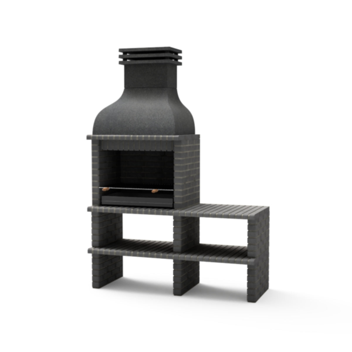 INCLUYE METAL PINTADO EN NEGRO Parrilla zincada con 84,5x55cm(4647cm2) Caballete lateral completo de ladrillo con 78x70cm Soporte inferior de ladrillo Barbacoa de obra completa.