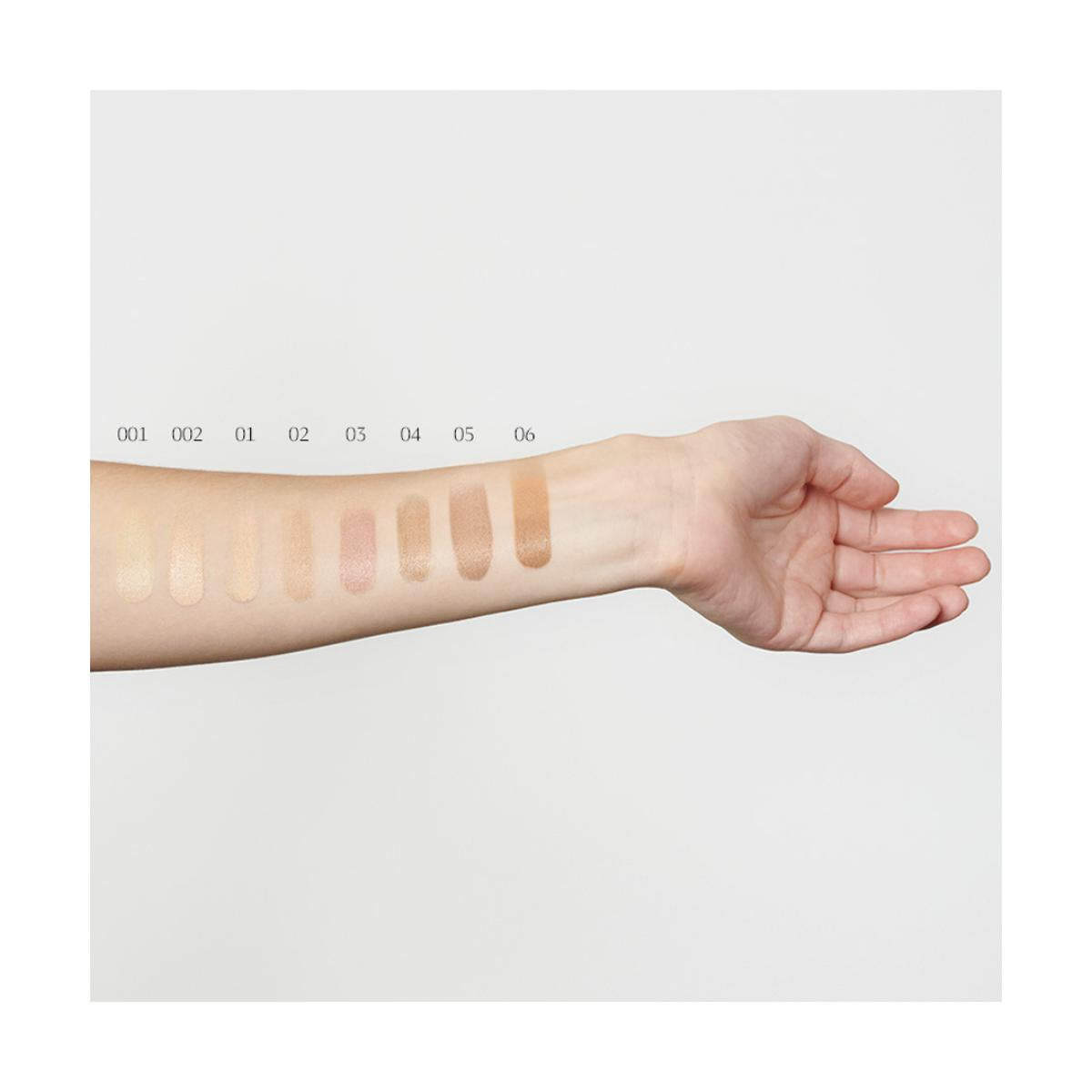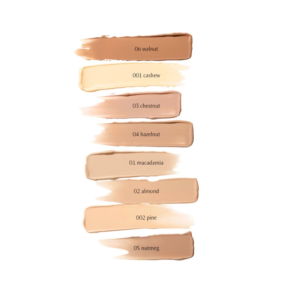 La base 001 cashew es un beige claro con un subtono ligeramente amarillo (cálido). Ideal para tonos de piel muy claros.