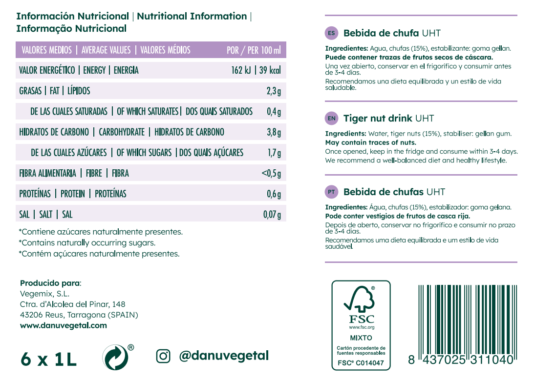 Agua, Chufas (15%), Estabilizante: Goma Gellan