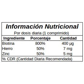 Contribuye al mantenimiento del cabello en condiciones normales.Biotina de Drasanvi es un complemento alimenticio, que combina la Biotina (también llamada Vitamina B7) con el Hierro y Zinc. La biotina y el Zinc contribuyen a mantenimiento de pelo, piel y uñas en condiciones normales.