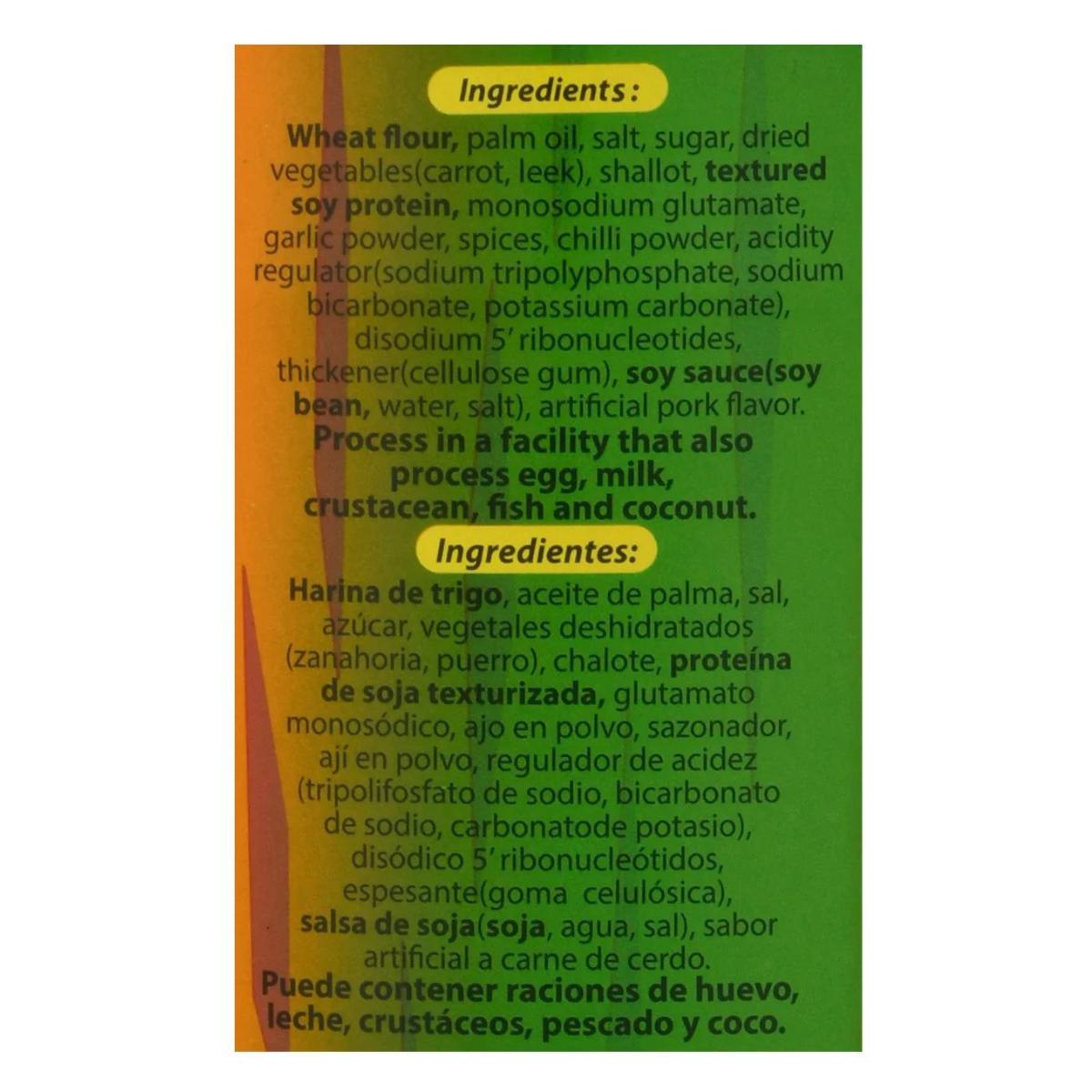 Harina de trigo, aceite de palma, sal, azúcar, vegetales deshidratados (zanahoria, puerro), chalote, proteína de soja texturizada, glutamato monosódico, ajo en polvo, sazonador, ají en polvo, regulador de acidez (tripolifosfato de sodio, bicarbonato de sodio, carbonatode potasio), disódico 5' ribonucleótidos, espesante(goma celulosica), salsa de soja(soja, agua, sal), sabor artificial a carne de cerdo. Puede contener raciones de huevo, leche, crustáceos, pescado y coco.