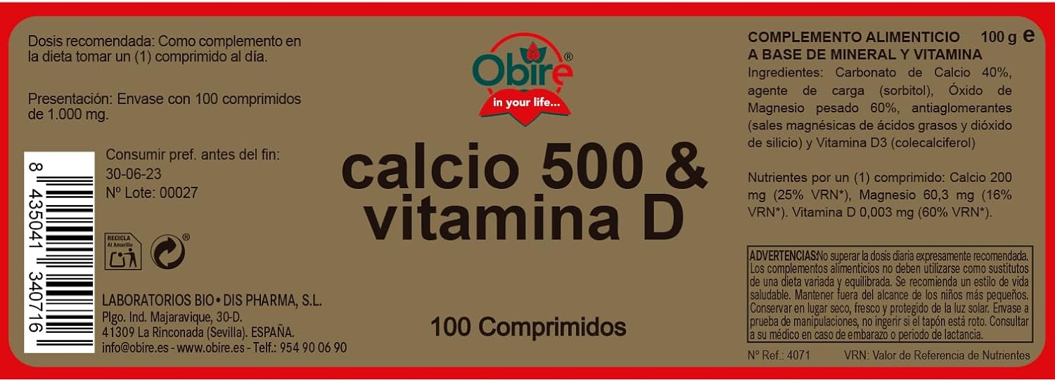 Obire | Calcio 500 y Vitamina D | 100 Comprimidos