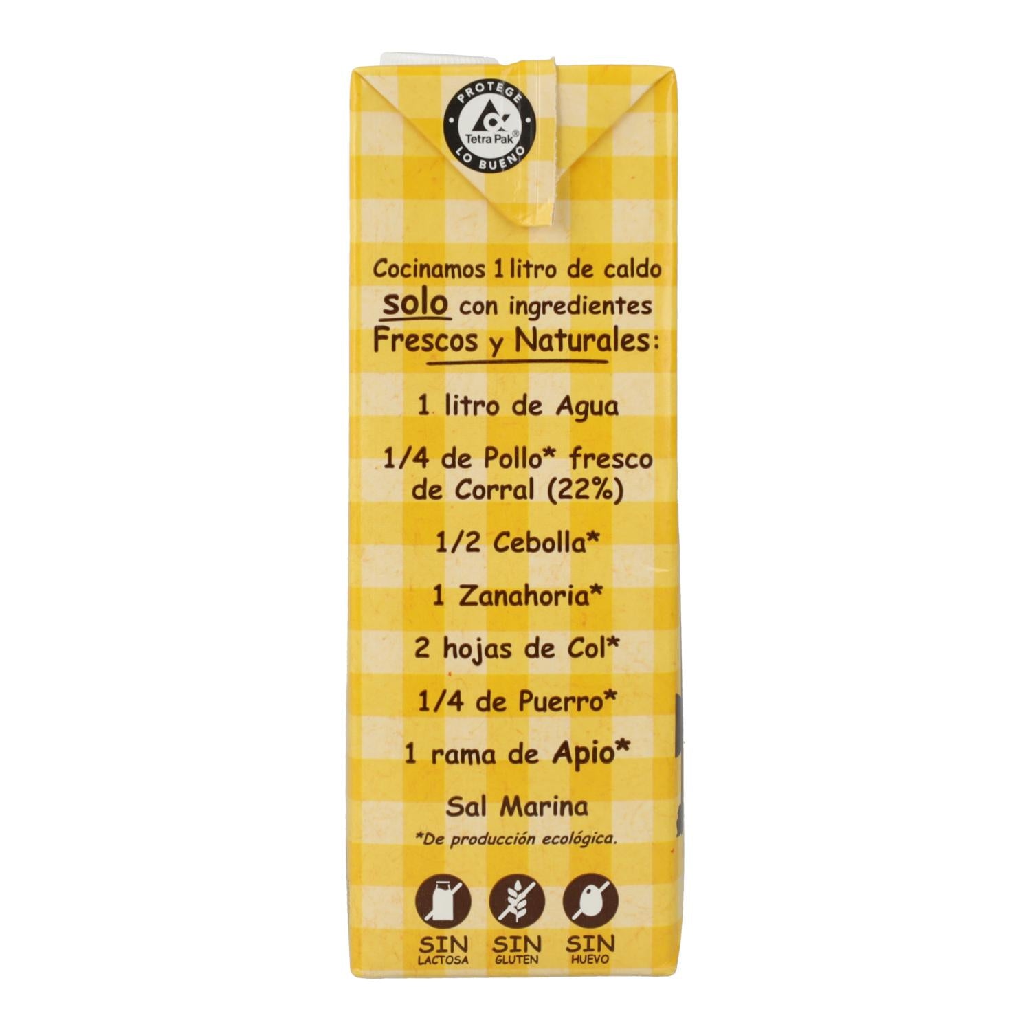 Caldo de pollo y hortalizas 100 % ecológico, elaborado mediante cocción lenta durante tres horas para mantener el sabor auténtico de sus ingredientes. Producto natural, sin concentrados, sin aditivos artificiales, sin lactosa, sin gluten y sin huevo.