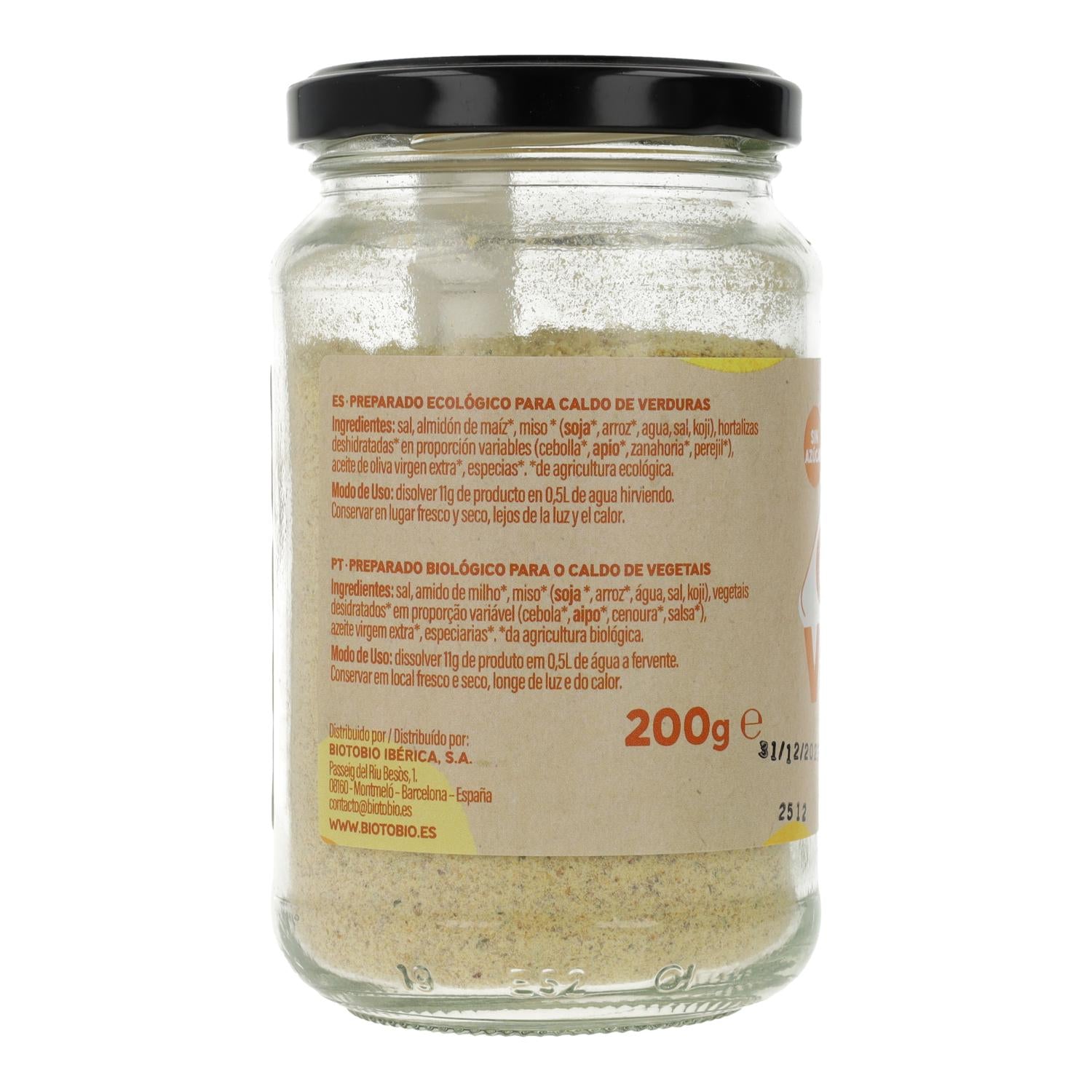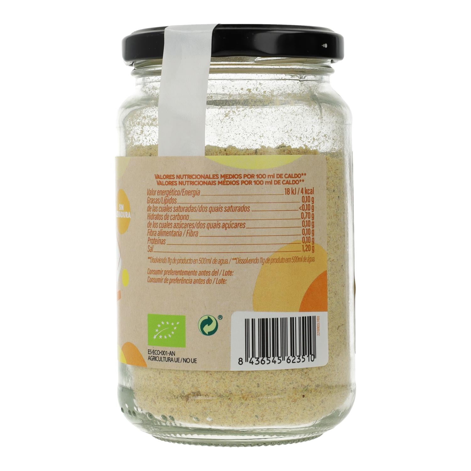 Caldo vegetal instantáneo en polvo ecológico, sin levadura, elaborado con verduras deshidratadas, miso y aceite de oliva virgen extra. Diseñado para añadir un sabor natural y equilibrado a los platos de forma rápida y saludable.