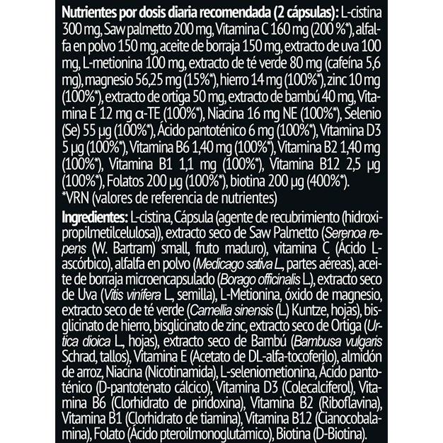Vitamina C (ácido ascórbico), biotina, zinc (óxido de zinc), colágeno hidrolizado, queratina, ácido hialurónico, extracto de ortiga (Urtica dioica), extracto de cola de caballo (Equisetum arvense), excipientes.