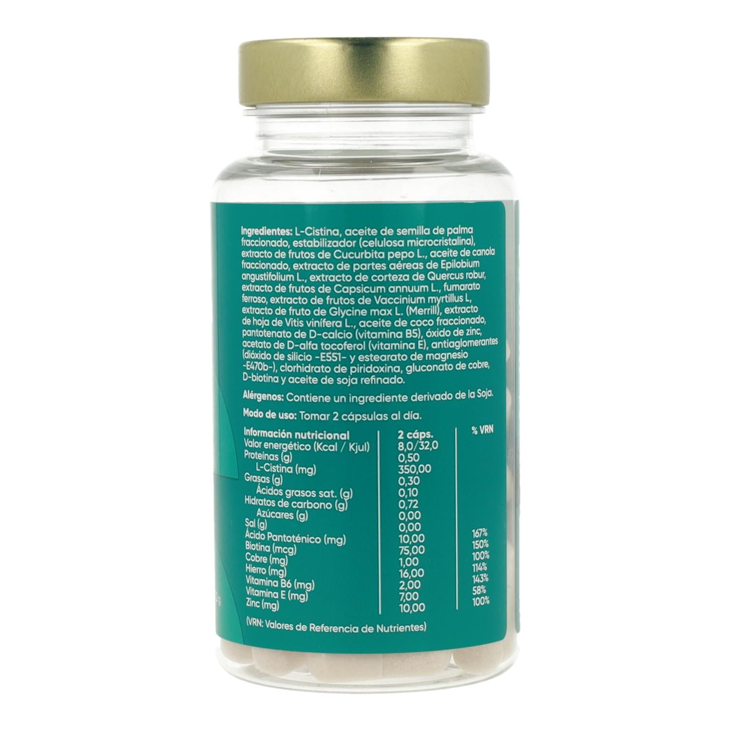 L-Cistina, aceite de semilla de palma fraccionado, estabilizador (celulosa microcristalina), extracto de frutos de Cucurbita pepo L., aceite de canola fraccionado, extracto de partes aéreas de Epilobium angustifolium L., extracto de corteza de Quercus robur, extracto de frutos de Capsicum annuum L., fumarato ferroso, extracto de frutos de Vaccinium myrtillus L, extracto de fruto de Glycine max L. (Merrill), extracto de hoja de Vitis vinífera L., aceite de coco fraccionado, pantotenato de D-calcio (vitamina B5), óxido de zinc, acetato de D-alfa tocoferol (vitamina E), antiaglomerantes (dióxido de silicio -E551- y estearato de magnesio -E470b-), clorhidrato de piridoxina, gluconato de cobre, D-biotina y aceite de soja refinado. Contiene un derivado de la soja.