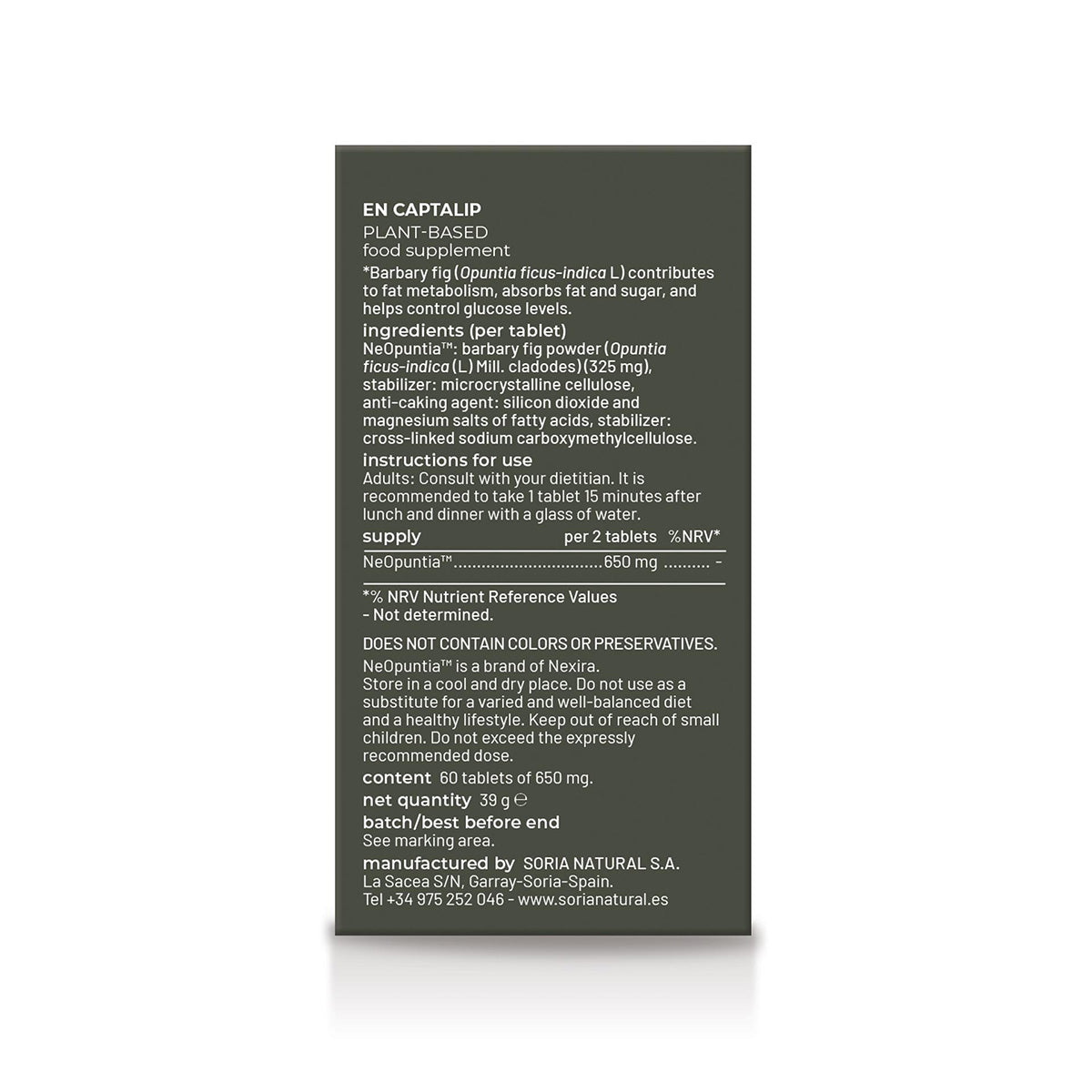 Por comprimido: NeOpuntia polvo de Opuntia (Opuntia ficus-indica (L) Mill, cladodios) (325 mg), estabilizante: celulosa microcristalina, antiaglomerante: dióxido de silicio, estabilizante: carboximetilcelulosa sódica reticulada, antiaglomerante: sales magnésicas de ácidos grasos.