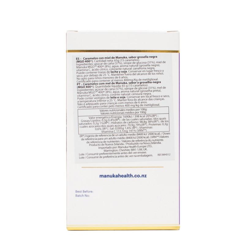 Toda la información sobre "Caramelos con miel de Manuka y grosella negra (MGO 400+) Manuka 15 uds 65 gr"