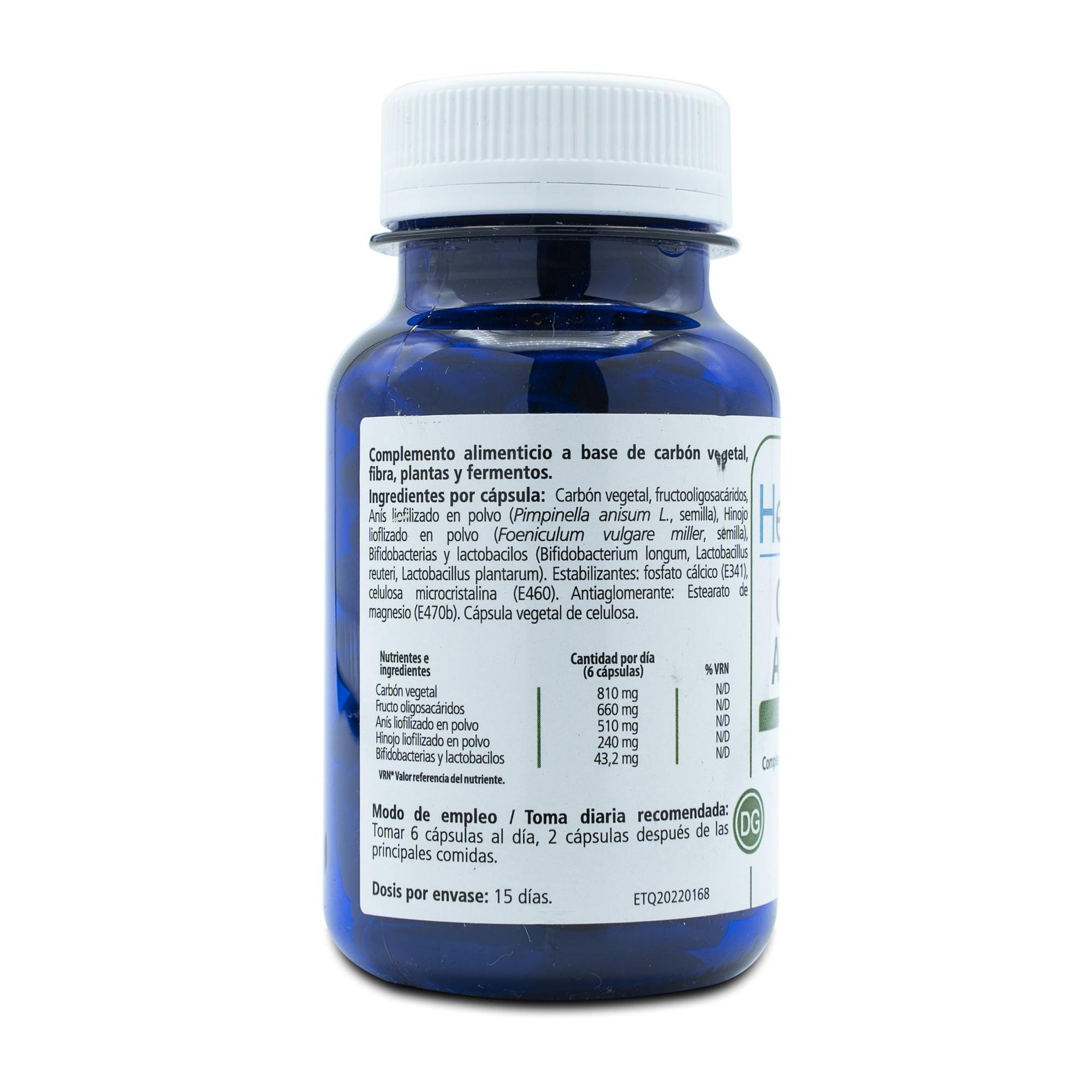 Carbón vegetal (135mg), fructooligosacáridos (110mg), anís lioflizado en polvo (Pimpinella anisum L., semilla) (85mg), hinojo liofilizado en polvo (Foeniculum vulgare miller, semilla) 40mg, 7,2mg de bifidobacterias y lactobacilos (Bifidobacterium longum (5X109 cfu/g), Lactobacillus reuteri (2,5X109 cfu/g), Lactobacillus plantarum (2,5X109 cfu/g). Estabilizantes: fosfato cálcico (E341), celulosa microcristalina (E460). Antiaglomerante: Estearato de magnesio (E470b). Cápsula vegetal de celulosa.