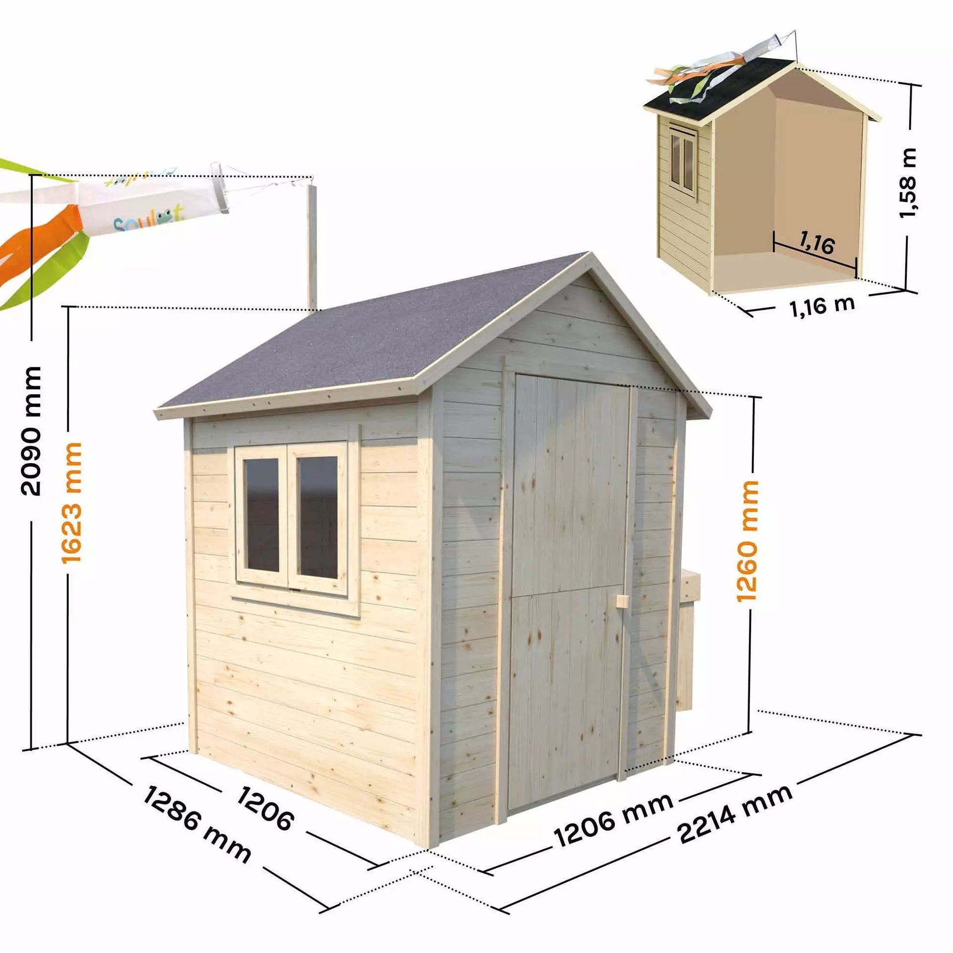Diseñada para acompañar a los niños en sus juegos durante mucho tiempo, la casita de madera Jasmine tiene una altura de 160 cm, la puerta mide 126 cm de alto por 56 cm de ancho y suelo de un grosor de 16 mm.