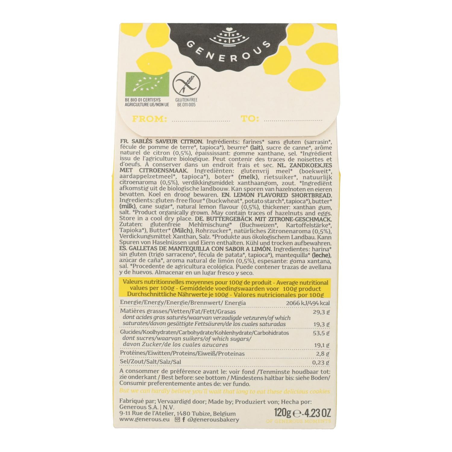 Mantequilla*(leche), harina de trigo sarraceno*, azúcar de caña*, fécula de patata*, harina de tapioca*, aroma natural de limón (0,05%), sal, espesante: goma xantana.