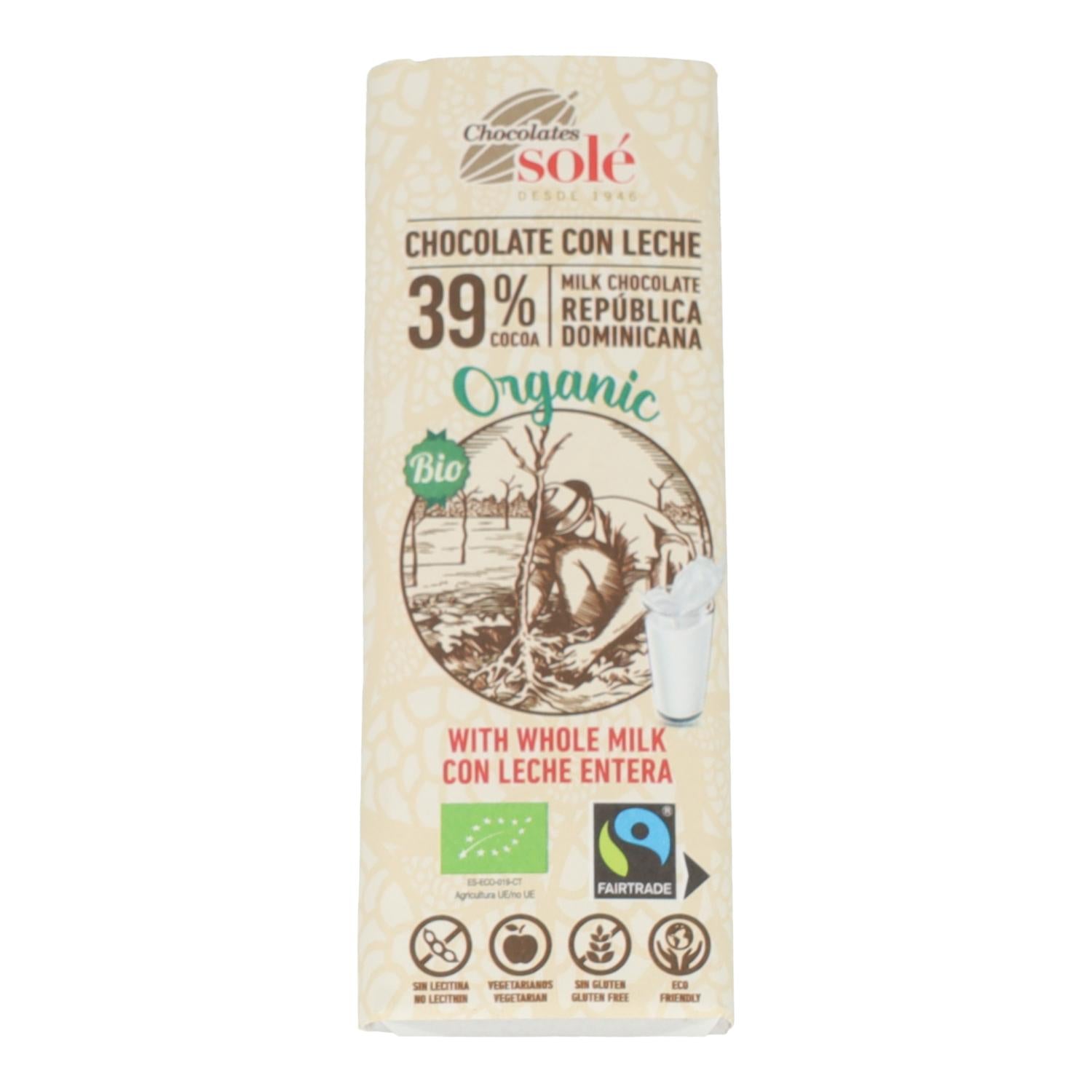 Chocolate con leche ecológico con un mínimo de 38% de cacao, elaborado con ingredientes de comercio justo. Producto sin gluten y sin lecitina, que ofrece un sabor exquisito y suave, ideal para quienes buscan un chocolate de calidad y sostenible.