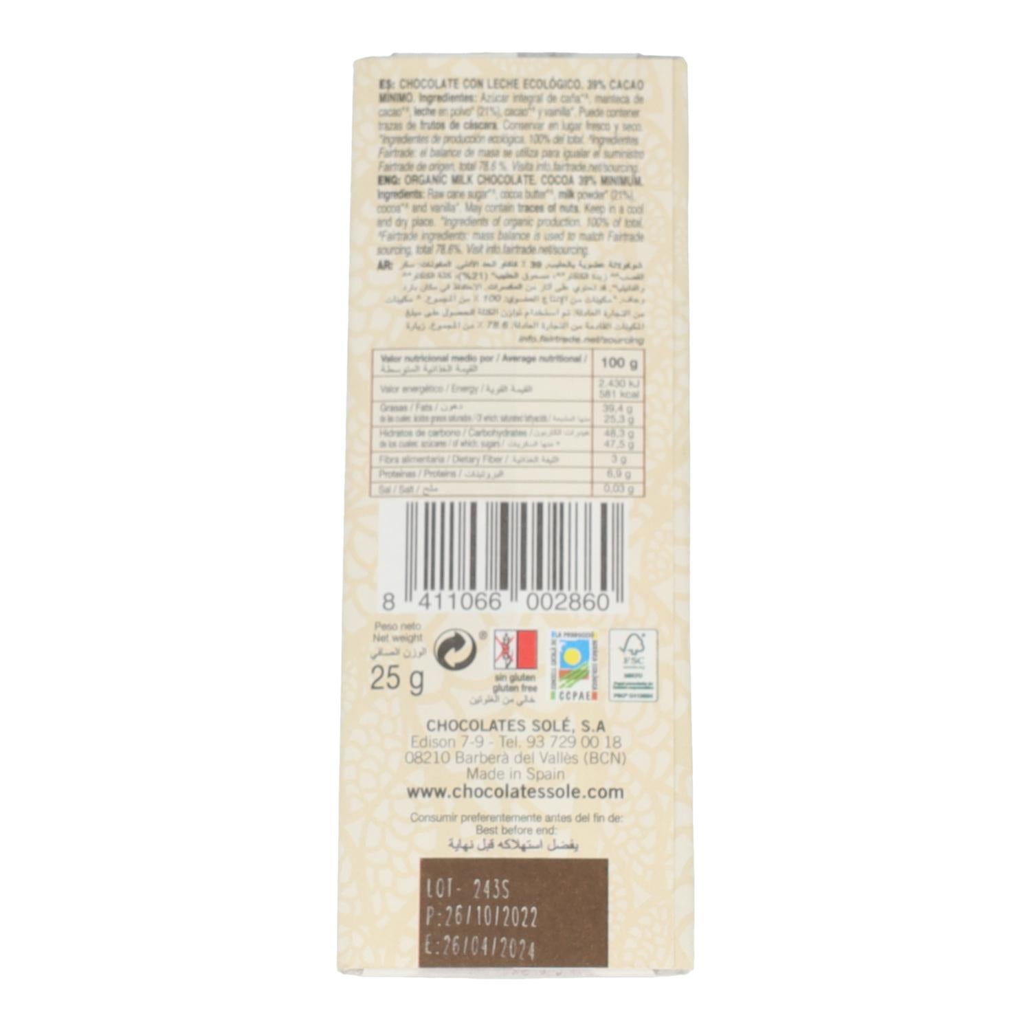 Chocolatina con Leche Bio Solé, 25 g