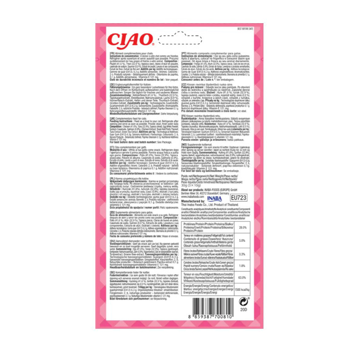 Composición: Pollo (41,6 %), Atún (32,9 %), Tapioca (seca), Claras de huevo en polvo, Caseinato de sodio, Salmón (0,9%), Extracto de pollo, Levadura y sus componentes, Extracto de atún