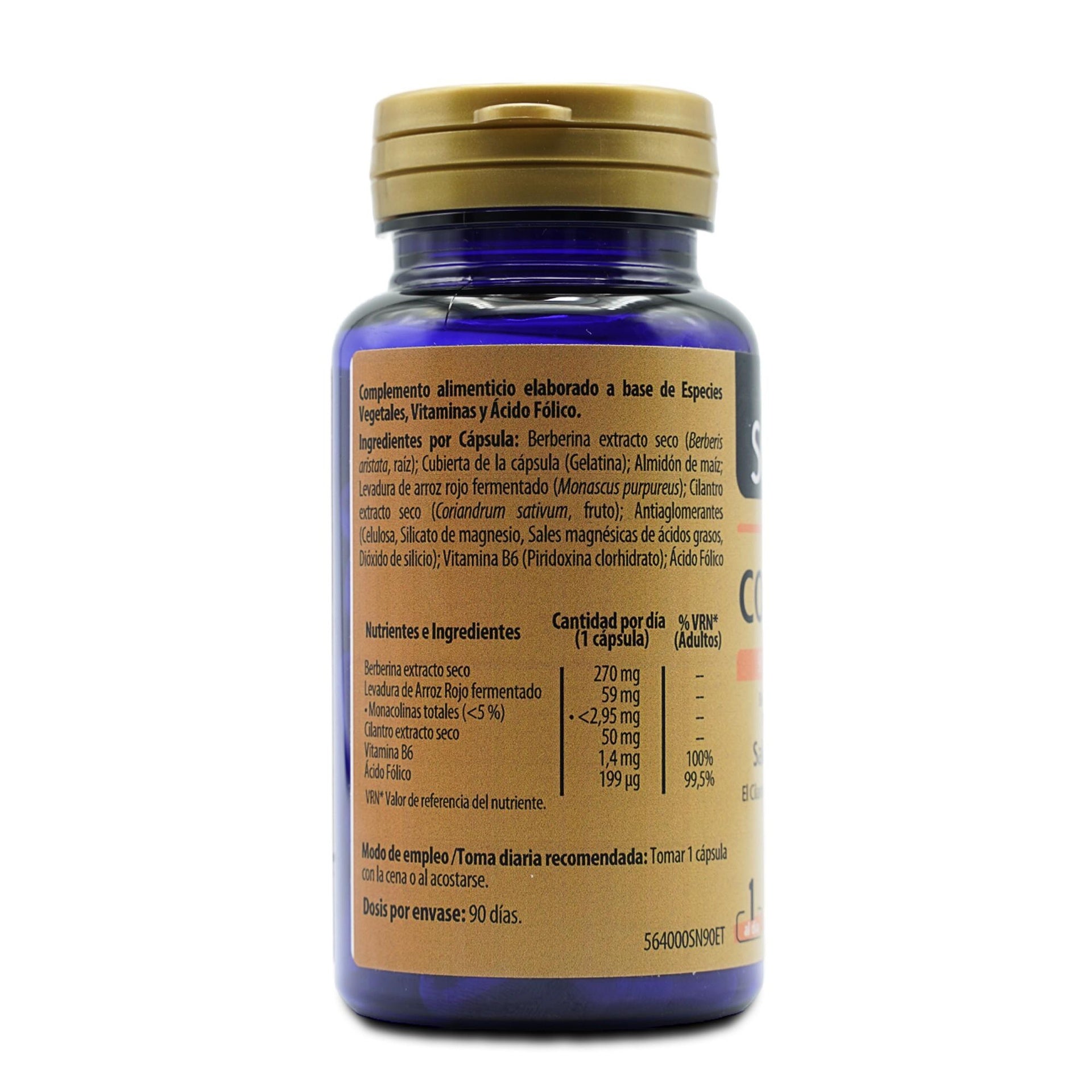 Berberina extracto seco (Berberis aristata, raíz); Almidón de maíz; Cubierta de la cápsula (Gelatina); Levadura de arroz rojo fermentado (Monascus purpureus); Antiaglomerantes (Celulosa, Silicato de magnesio, Sales magnésicas de ácidos grasos, Dióxido de silicio); Vitamina B6 (Piridoxina clorhidrato); Ácido Fólico