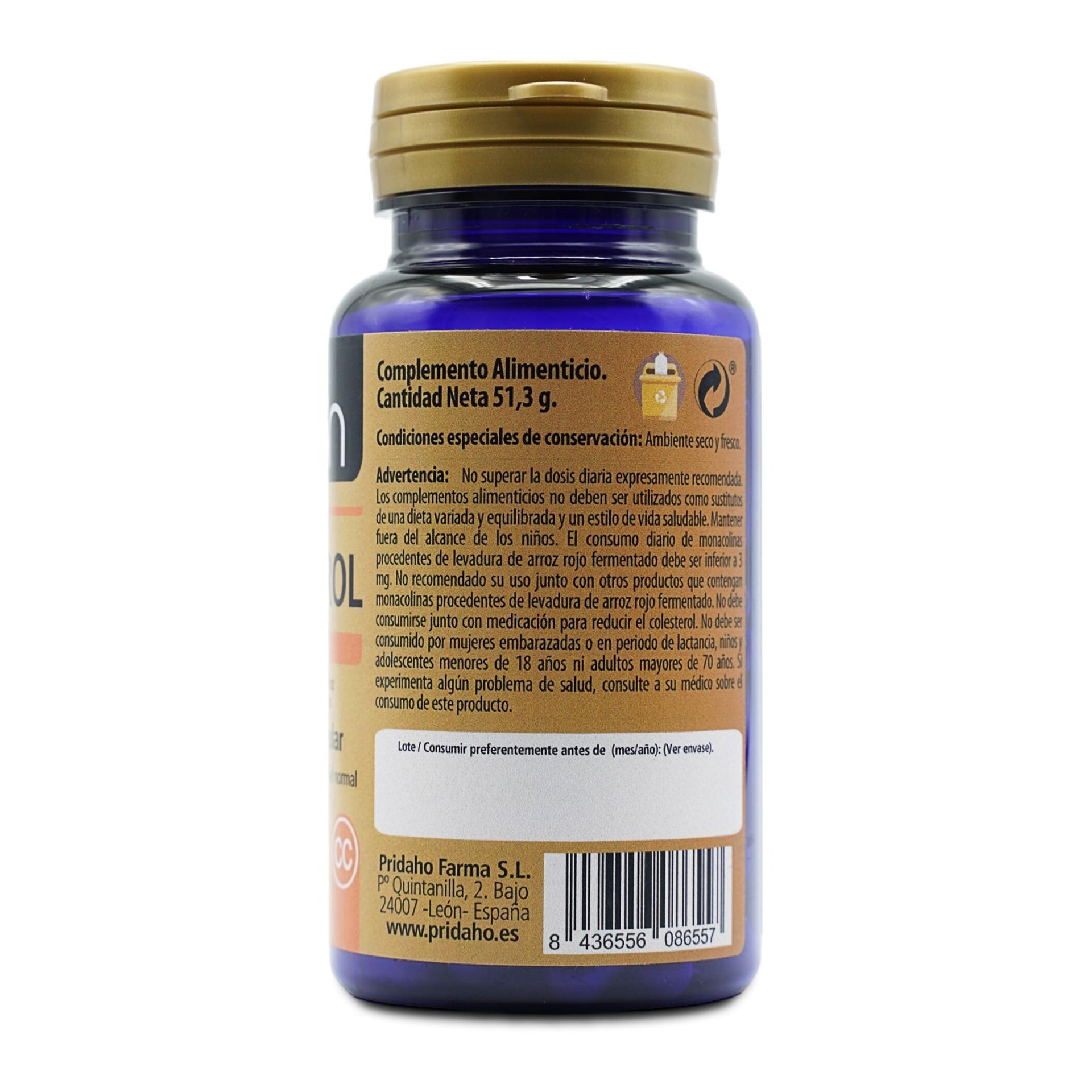 No superar la dosis diaria expresamente recomendada. Los complementos alimenticios no deben ser utilizados como sustitutos de una dieta variada y equilibrada y un estilo de vida saludable. Mantener fuera del alcance de los niños. El consumo diario de monacolinas procedentes de levadura de arroz rojo fermentado debe ser inferior a 3 mg. No debe consumirse si ya se consume otros productos que contienen arroz fermentado con levadura roja. No debe consumirse junto con medicación para reducir el colesterol. No debe ser consumido por mujeres embarazadas o en periodo de lactancia, niños y adolescentes menores de 18 años ni adultos mayores de 70 años. Si experimenta algún problema de salud, consulte a su médico sobre el consumo de este producto