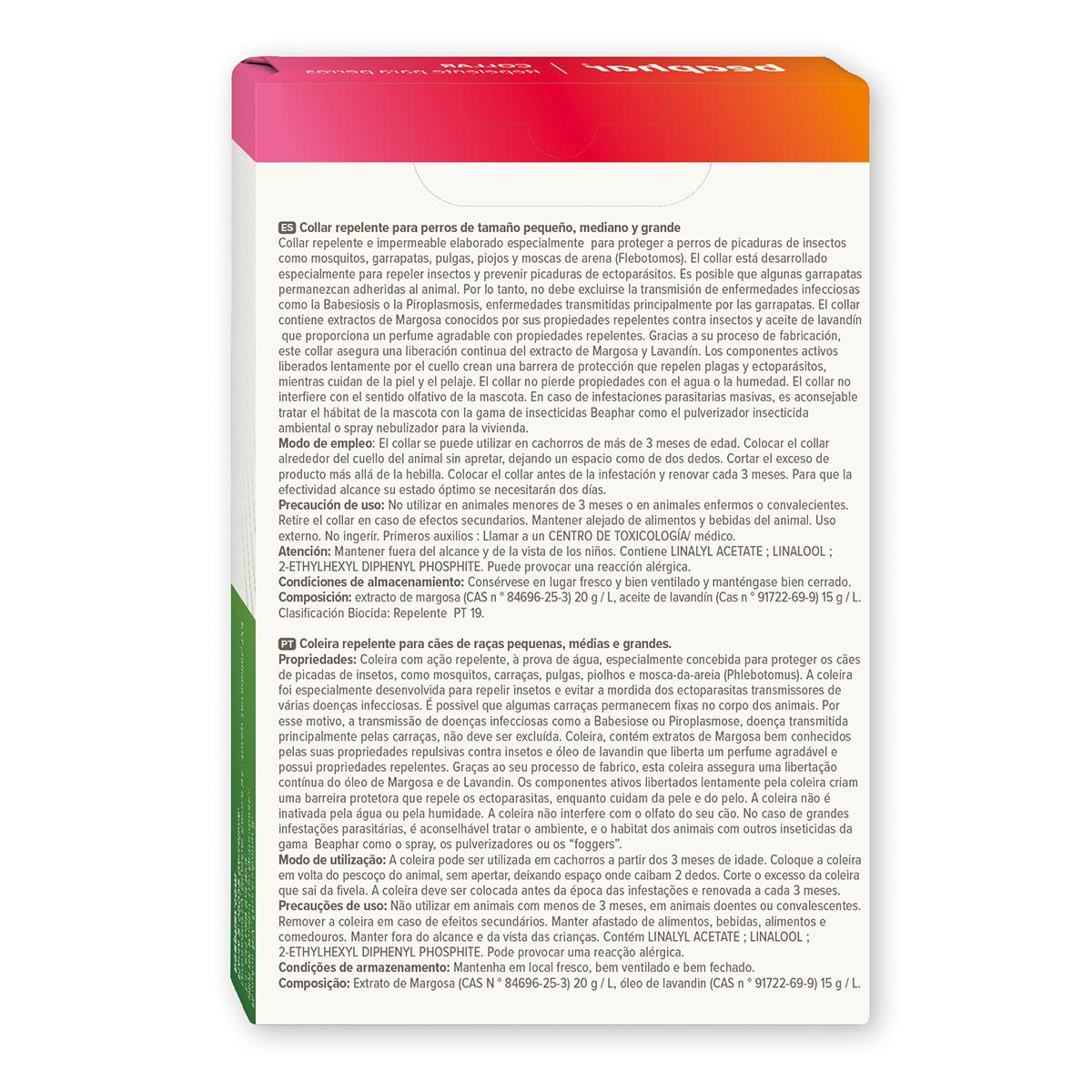 El Collar Repelente de Beaphar contiene extracto de Margosa (aceite de Neem) conocido por su propiedades repelentes contra insectos y Aceite de lavandín que proporciona un perfume agradable a la vez que contiene propiedades repelentes. Gracias a su proceso de fabricación, este collar asegura una liberación continua del extracto de Margosa y Lavandín.