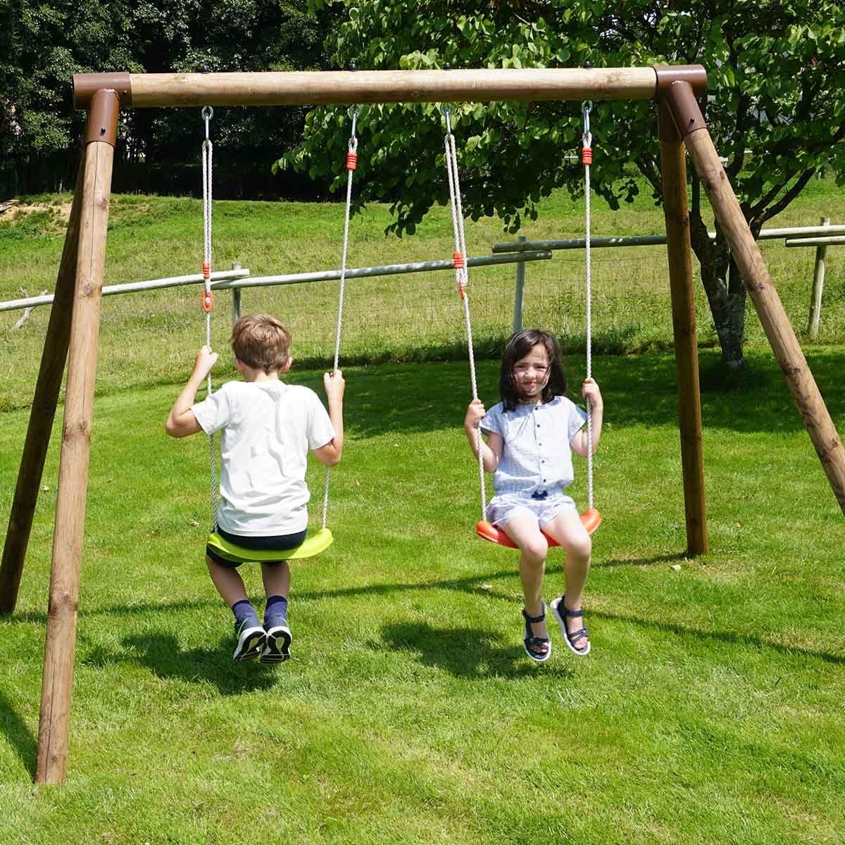 Este pórtico de madera Alizée, compuesto por dos columpios regulables, es ideal para los niños que sueñan con columpiarse todo el día, solos o acompañados. Sus hijos, de 3 a 12 año, podrán pasar agradables momentos de diversión en un ambiente de calma y tranquilidad. El peso máximo soportado es de 5 kg por aparato.
