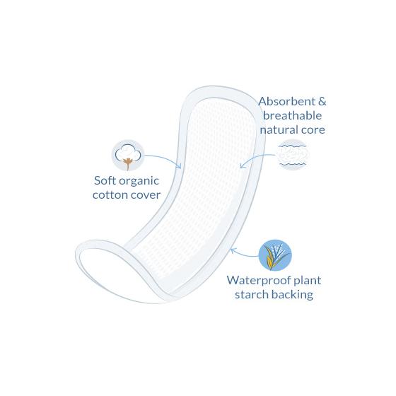 Ingredientes: Algodón orgánico certificado, pulpa de celulosa ecológicamente certificada, almidón de maíz sin OGM, adhesivo inocuo para la salud