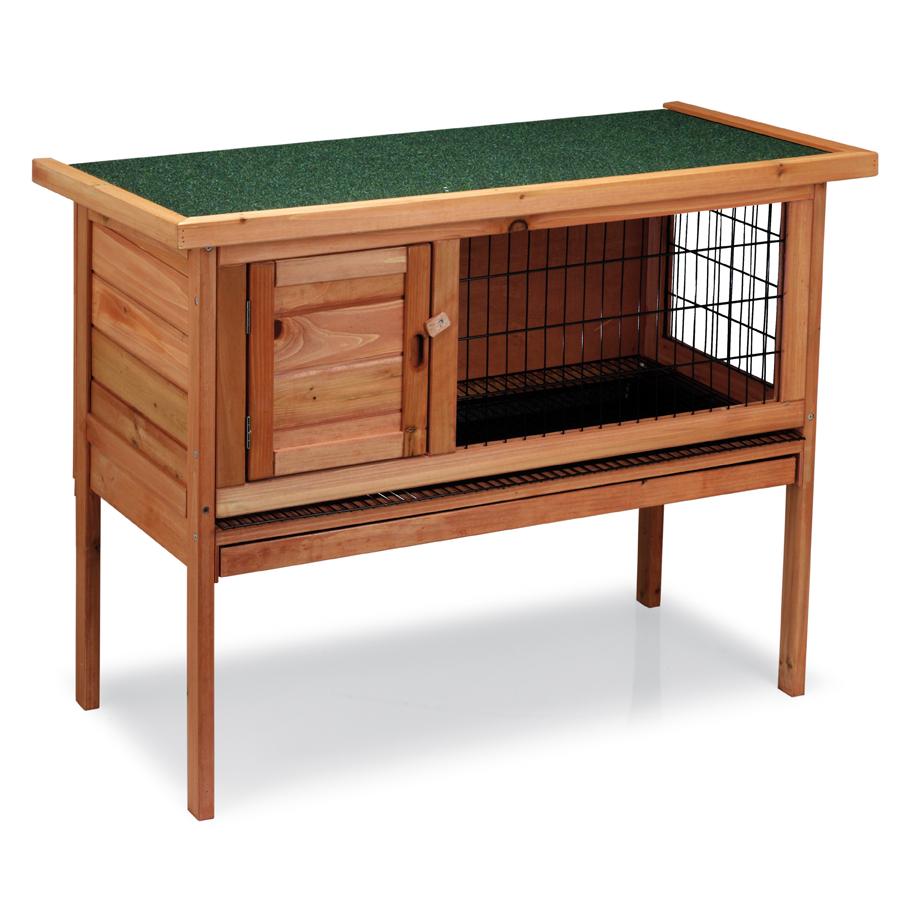 Conejera de madera de forma rectangular con patas, provista de techo impermeable y abatible. Dispone de 1 puerta frontal en el nido. Tiene una bandeja colectora extraible.