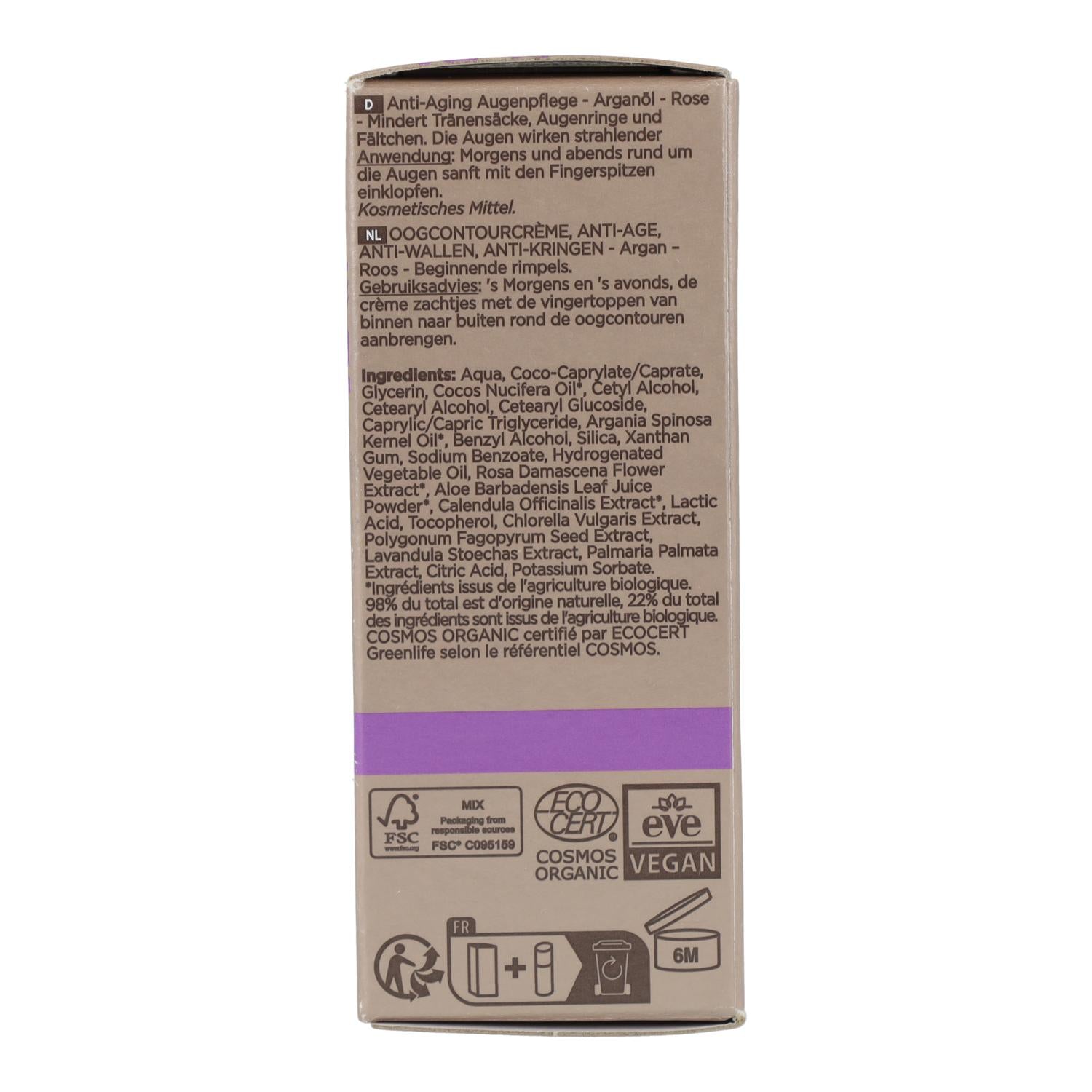 INCI: Aqua, Coco Caprylate/Caprate, Rosa Damascena Flower Water*, Glycerin, Cocos Nucifera Oil*, Cetyl Alcohol, Cetearyl Alcohol, Cetearyl Glucoside, Magnesium Silicate, Caprylic/Capric Triglyceride, Argania Spinosa Kernel Oil*, Chlorella Vulgaris Extract, Palmaria Palmata Extract, Hydrogenated Vegetable Oil, Polygonum Fagopyrum Seed Extract, Calendula Officinalis Extract*, Lavandula Stoechas Extract, Sodium Benzoate, Benzyl Alcohol, Xanthan Gum, Lactic Acid, Potassium Sorbate, Citric Acid. *Ingredientes procedentes de agricultura ecológica 99% del total de los ingredientes es de origen natural 11,7% del total de los ingredientes procede de la agricultura ecológica