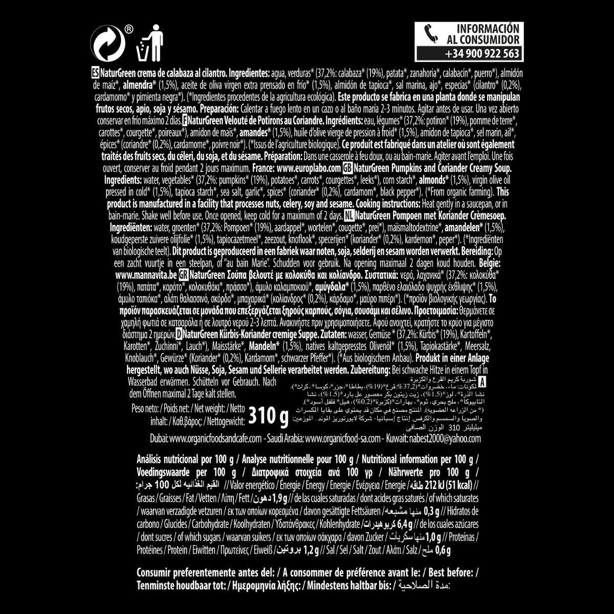 Toda la información sobre "Crema de Calabaza y Cilantro Naturgreen, 310 g"