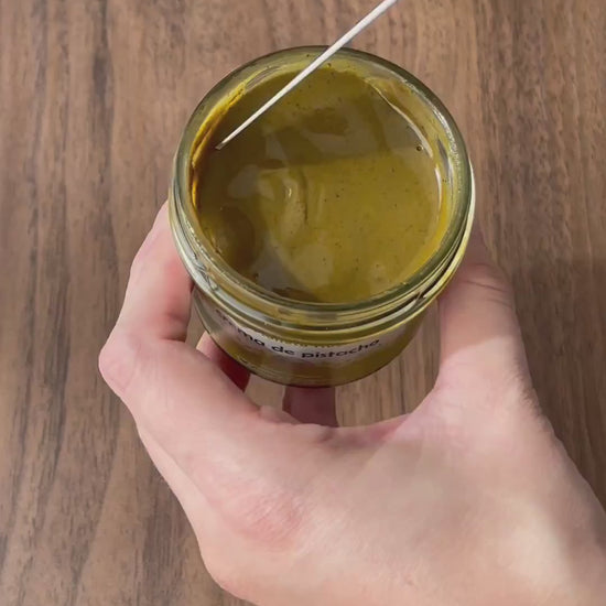 Crema elaborada exclusivamente con pistacho ecológico. Es ideal para usar como relleno en crepes, galletas o como base para mousse. Apta para personas veganas y con intolerancia al gluten. Producto de origen español.