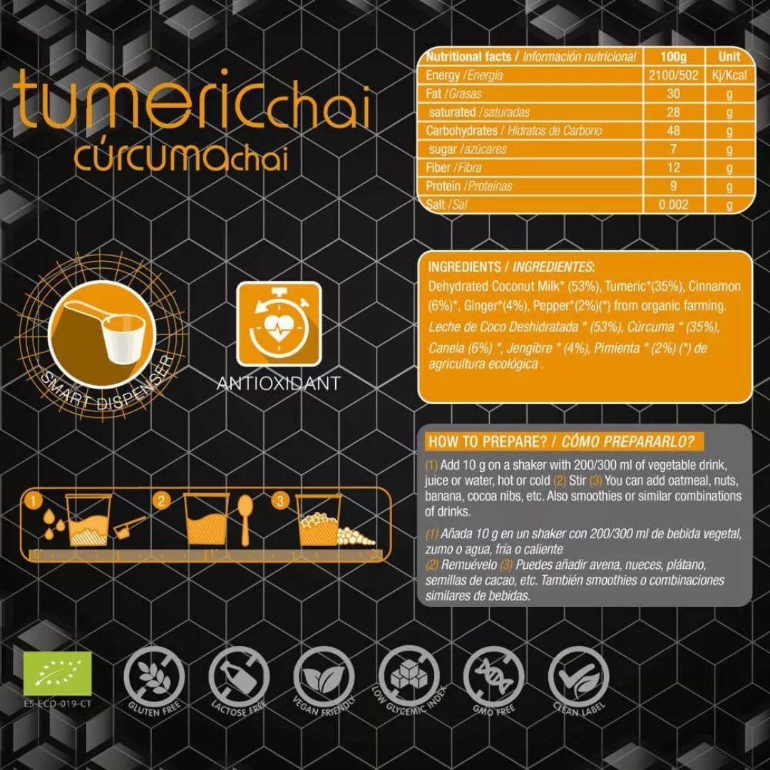La exclusiva fórmula del Cúrcuma Chai de Nutrición Deportiva Ecológica de Energy Feelings armoniza un exquisito sabor y textura con las propiedades nutricionales excepcionales de los súper alimentos que la componen. Delicioso sabor aromático e intenso color típico de la cúrcuma, pudiendo disfrutarlo tanto frío como caliente.