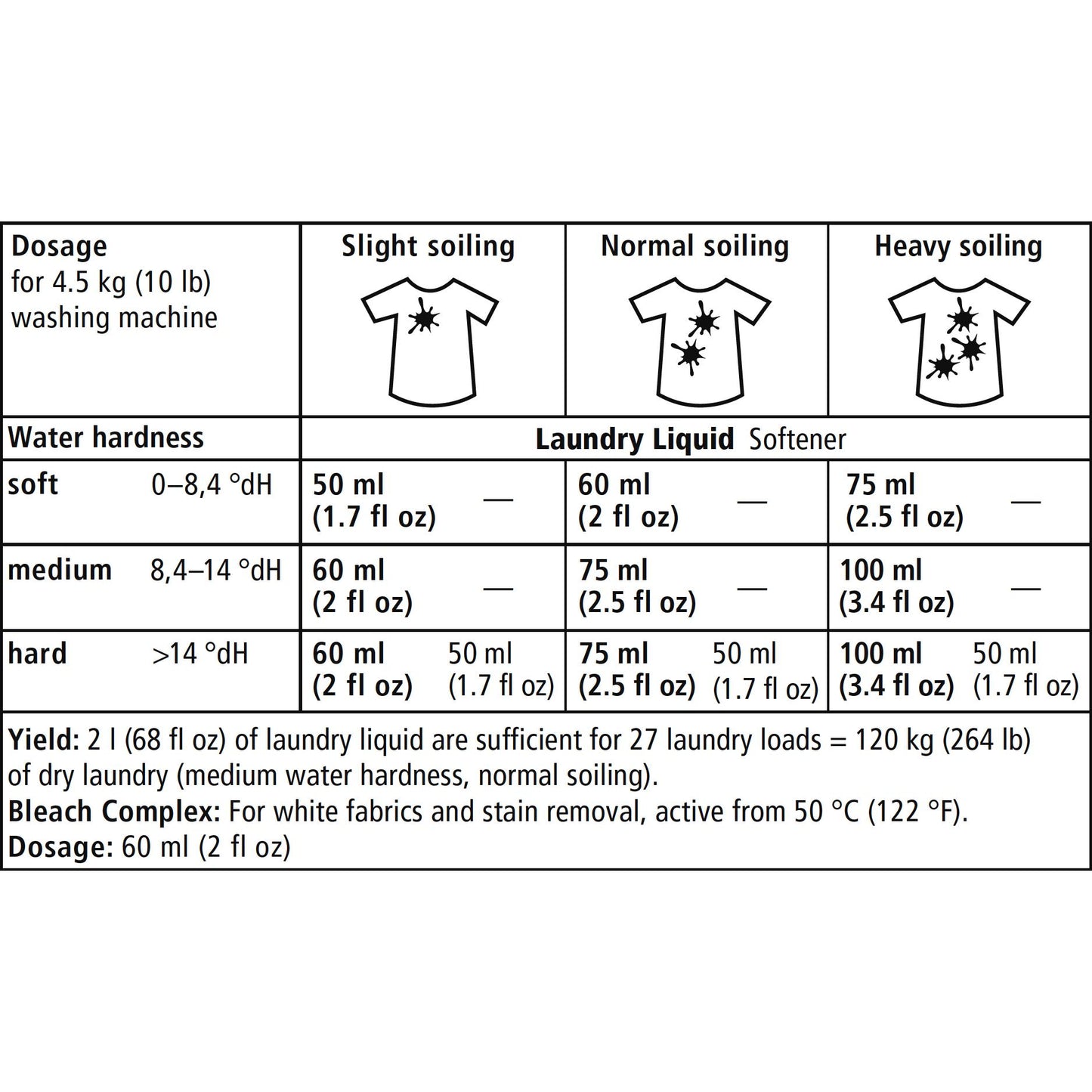 • Lavado a máquina: Dosificar según la dureza del agua y grado de suciedad, normalmente entre 30 y 60 ml por lavado.