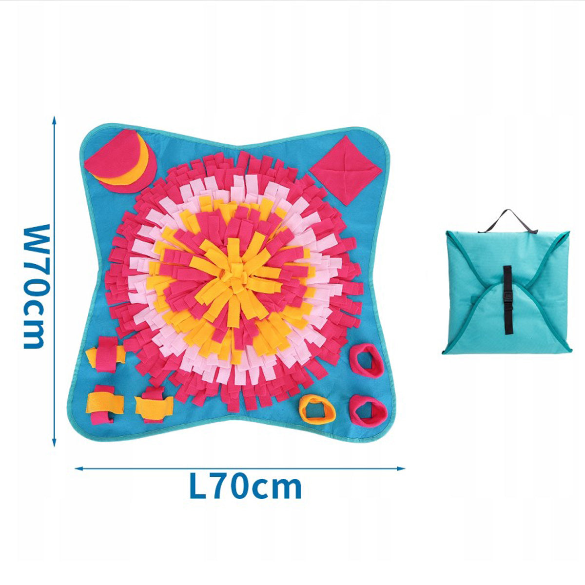 La alfombra, hecha con tiras de material, permite esconder golosinas que el perro debe encontrar usando su sentido del olfato. Las golosinas están ocultas, por lo que el perro no puede verlas directamente y debe confiar en su instinto natural de rastreo. La alfombra no solo ofrece diversión, sino que también ayuda a resolver problemas de comportamiento. Es ideal para perros que comen demasiado rápido, son quisquillosos con la comida, son hiperactivos o se están recuperando de intervenciones quirúrgicas.
