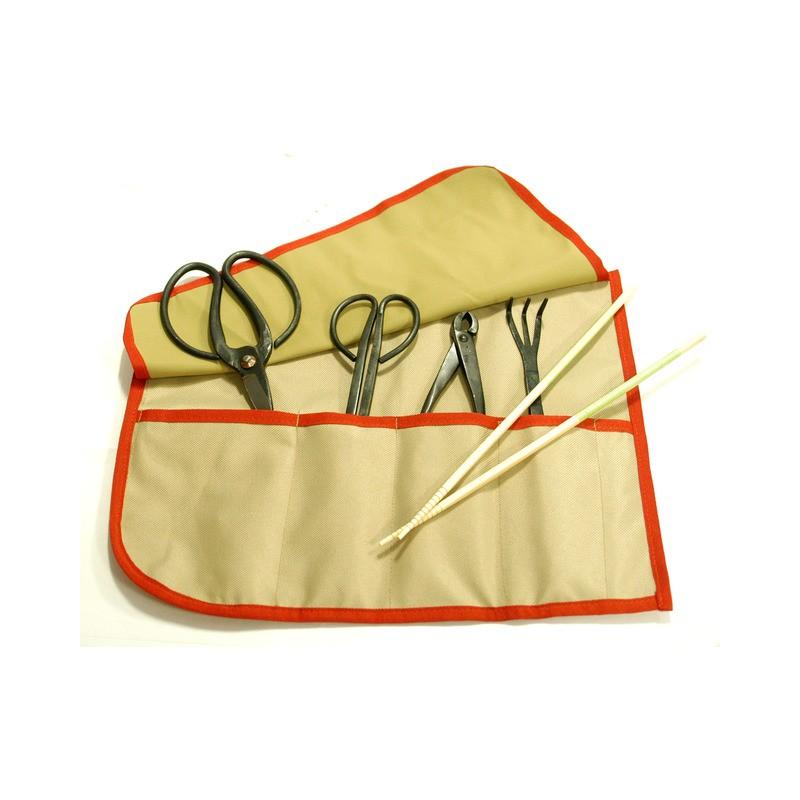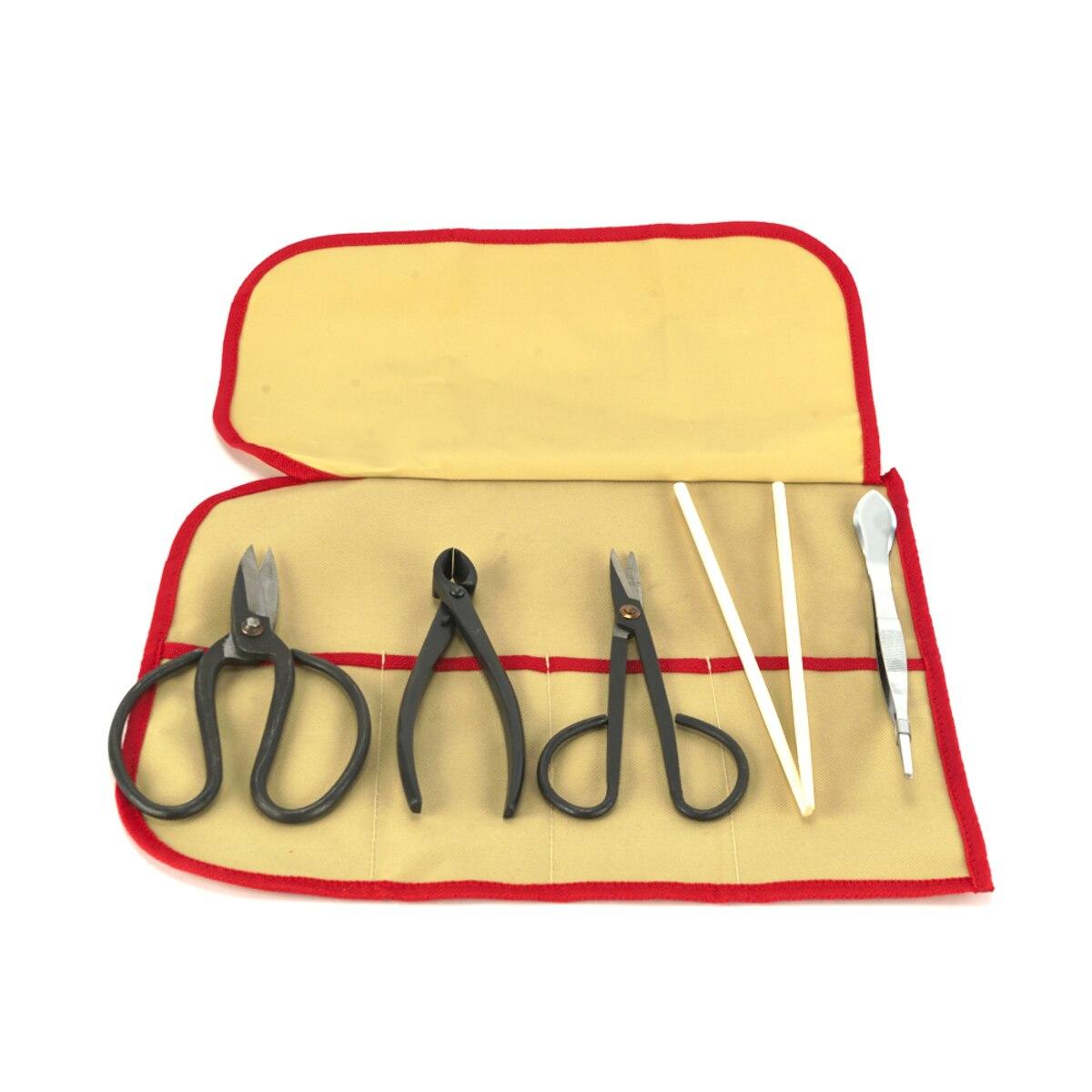 Estuche con las primeras herramientas imprescindibles para el cultivo de los bonsáis. Este estuche contiene cinco herramientas: una podadora cóncava recta, unas pinzas, una tijera fina para pinzar, una tijera gruesa para cortar ramas y dos palillos que usaremos durante el trasplante. Con estas herramientas podemos realizar la mayor parte de los trabajos necesarios para mantener en forma nuestros bonsáis.