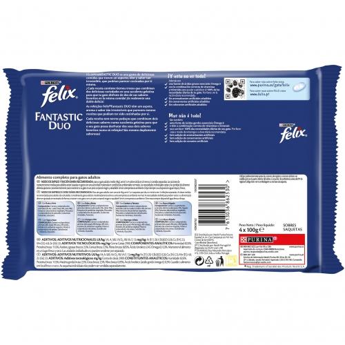 FELIX Fantastic DUO es una gama de deliciosas comidas que tienen un aspecto, olor y sabor tan irresistible, que podrían parecer comida cocinada por ti mismo. Cada receta contiene tiernos trozos que combinan dos deliciosas variedades de carnes y pescados en una suculenta gelatina para que tu gato disfrute de dos de sus sabores favoritos en la misma comida.