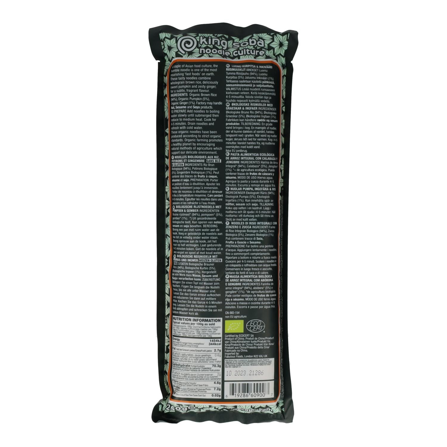 Toda la información sobre "Fideos Noodles de Arroz integral, Calabaza y Jengibre King Soba 250 g"