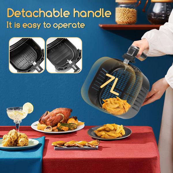 • La freidora cuenta con 7 funciones pre-programadas: patatas, gambas, pollo, ternera, carne, pescado, tarta y mantener caliente. Su uso es muy sencillo sólo tiene que seleccionar la función que quiera usar en su pantalla LED o si lo prefiere hacer un ajuste manual dispone de 80 °C a 200 °C de temperatura y de un tiempo ajustable de 0 a 60 min. También incluye 20 recetas pdf para proporcionarle ideas adicionales.