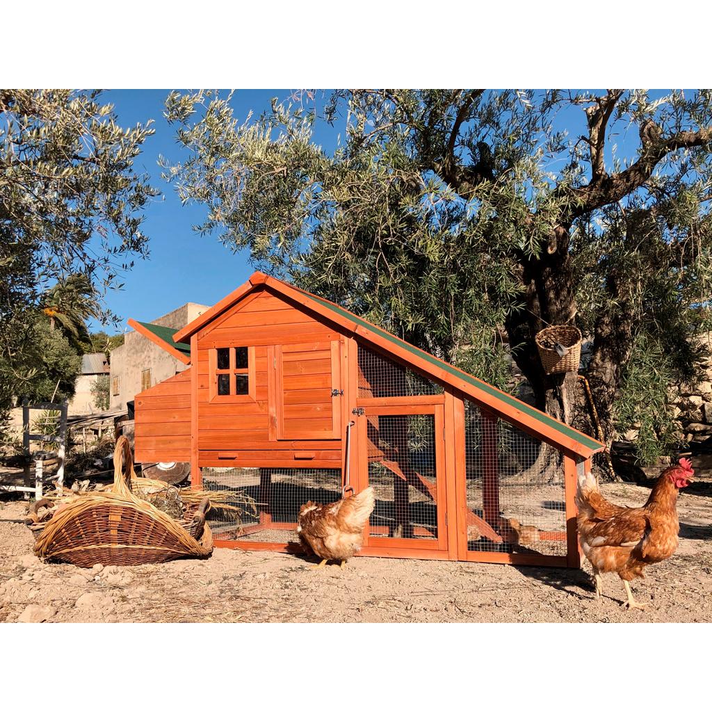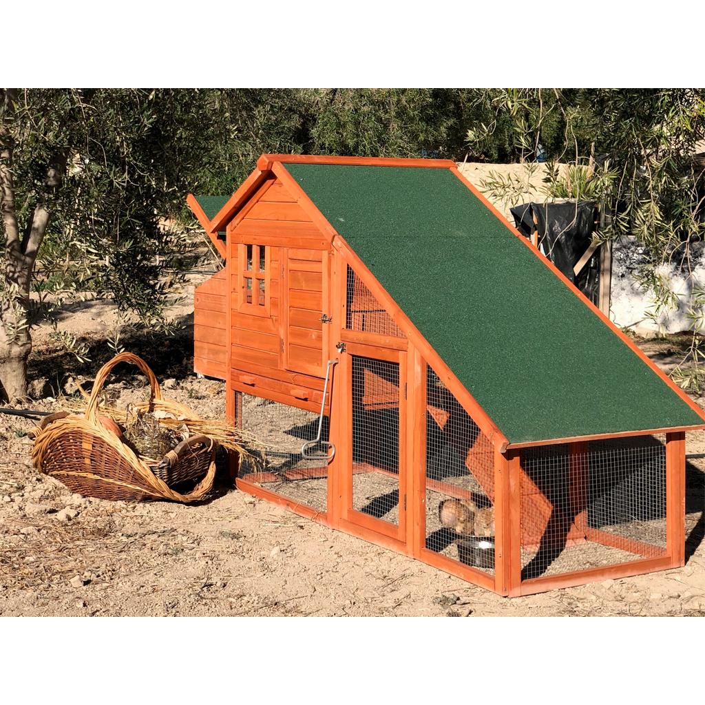 Gallinero rectangular con nido incorporado, prefabricado de madera tratada para exterior y malla metálica galvanizada.
