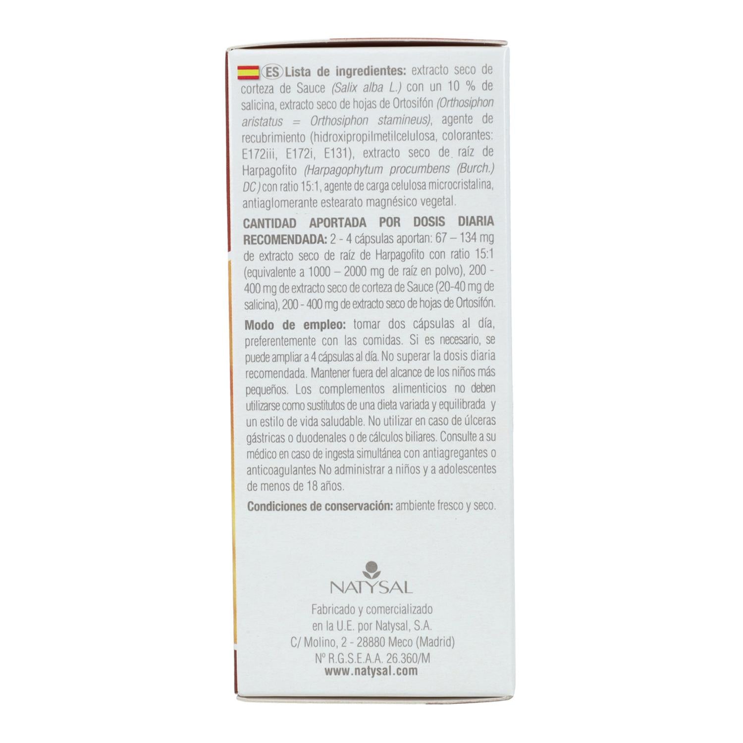 Extracto seco de raíz de Harpagofito (Harpagophytum procumbens (Burch.) DC) (3 % iridoides totales calculados como harpagósido y ratio 2:1), extracto seco de corteza de Sauce (Salix alba L.) (10 % derivados salicílicos totales calculados como salicina), extracto seco de hojas de Ortosifón (Orthosiphon anistatus (Bl.) Miq.(= Orthosiphon stamineus Benth.) (0,1 % sinensetina), cubierta de la cápsula (hipromelosa, colorante: carbonato de calcio y almidón modificado), agente de carga celulosa microcristalina, antiaglomerante estearato magnésico vegetal.