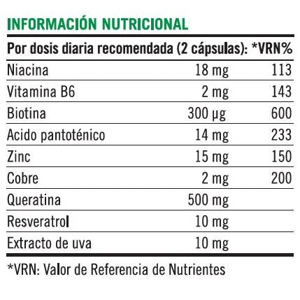 Queratina (Cynatine® HNS Keratin), agente de recubrimiento (gelatina (de bovino)), agente de carga (fosfato dicálcico), biotina (D-biotina), resveratrol (extracto de raíz Polygonum cuspidatum), zinc (óxido de zinc), ácido pantoténico (D-pantotenato de calcio), niacina (nicotinamida), cobre (gluconato de cobre), antiaglomerantes (dióxido de silicio, estearato de magnesio vegetal), extracto de uva (Vitis vinifera), vitamina B6 (clorhidrato de piridixina).