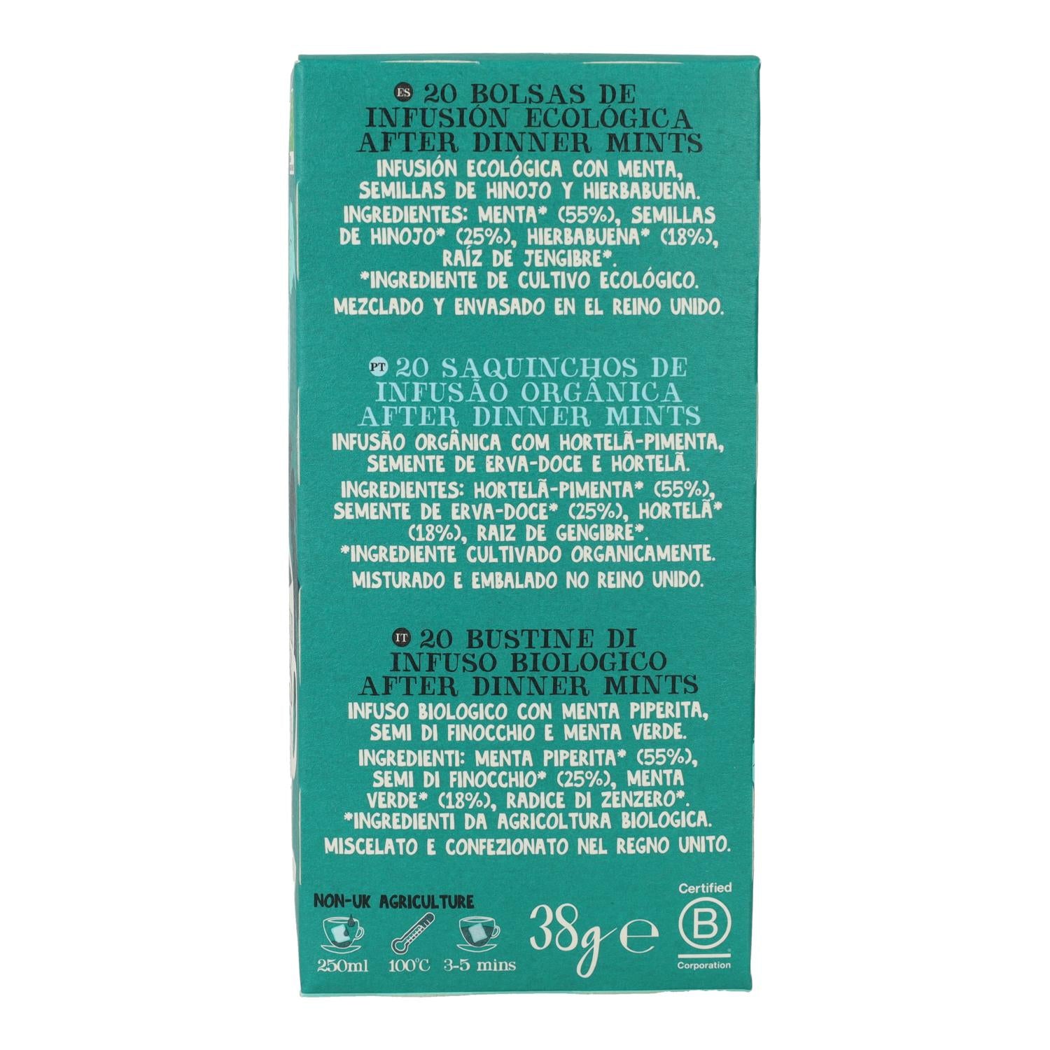 Infusión ecológica formulada para favorecer la digestión tras las comidas. Su mezcla de menta, hinojo, hierbabuena y jengibre ofrece una experiencia refrescante y reconfortante. Ideal para tomar después de la cena, ayudando a aliviar la sensación de pesadez y promoviendo una digestión más ligera.
