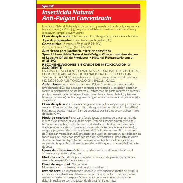 Dosis de aplicación: Para ácaros (araña roja), pulgones, y orugas y cicadélidos, mezclar 10 ml de producto por I litro de agua. Volumen de caldo I litro/10 m2. Para mosca blanca, mezclar 15 ml de producto por litro de agua y aplicar I litro de caldo/10 m2.