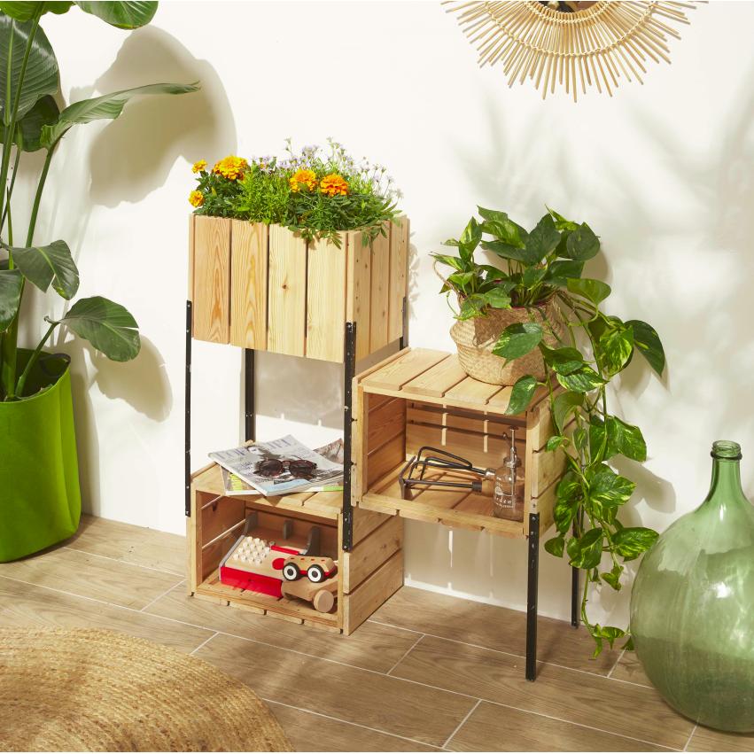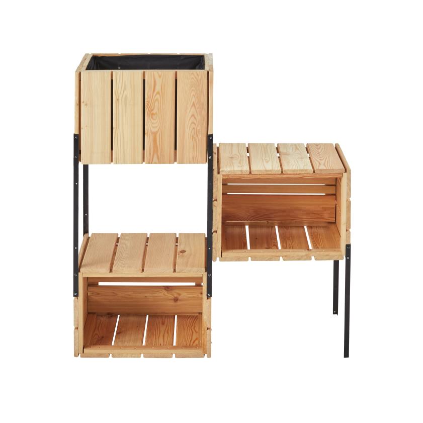 La estructura modular de 3 piezas Forest-Style y su mezcla de materiales de madera y metal realzarán su balcón. Un producto: 2 funciones. La estructura modular ACANTA puede utilizarse como jardinera y también convertirse en estantería. Puede plantar hierbas, verduras o flores en los 3 contenedores. Si desea aprovechar al máximo su espacio exterior, convierta la estructura de jardinera ACANTA en una estantería para guardar libros, herramientas o adornos. Se entrega en kit para un montaje fácil y rápido y con fieltro geotextil para evitar el crecimiento de malas hierbas y permitir un buen desarrollo de las raíces de sus plantas. Fabricada en alerce, la estructura ACANTA es muy robusta. La madera utilizada para fabricar la estructura ACANTA cuenta con la certificación FSC®/PEFC, lo que significa que la madera utilizada para su fabricación procede de bosques gestionados de forma responsable.Para acondicionar sus pequeños espacios, la gama ACANTA incluye varios productos: jardineras, estructura modular, huerto y mesa de bar plegable.