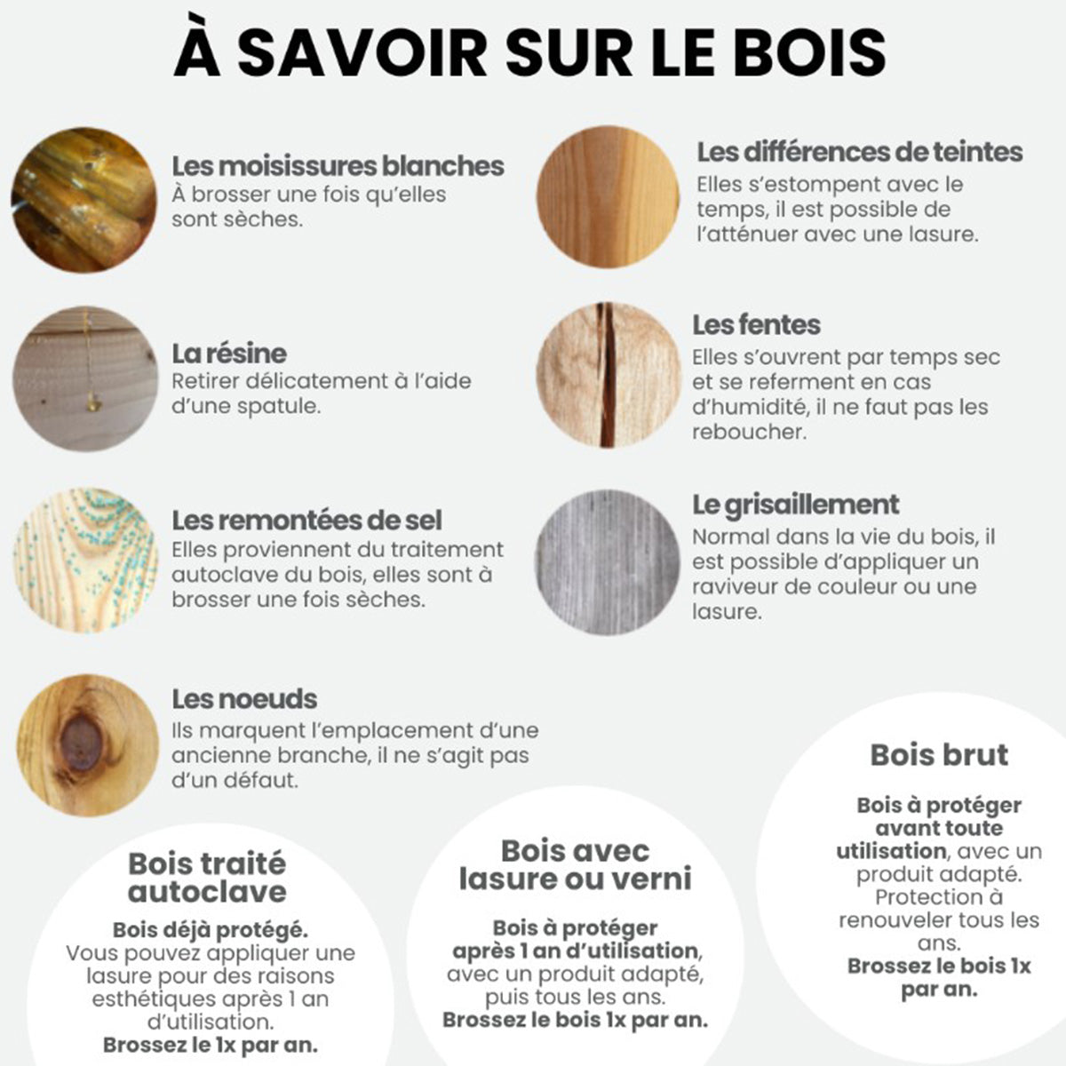 Madera ya protegida. Por razones estéticas se puede aplicar un tinte y/o lasur, pero no antes de un año de uso. Limpiar con un cepillo una vez al año