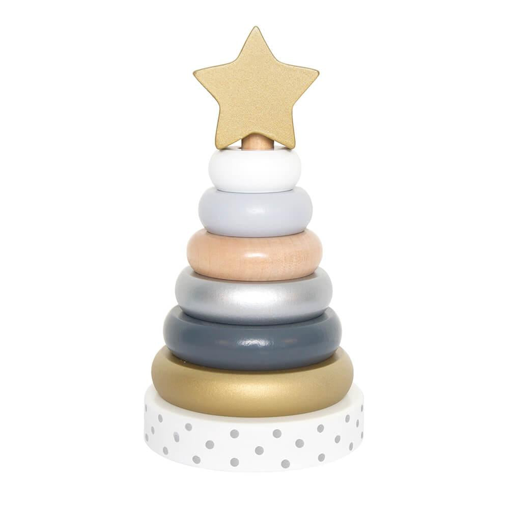 Nuestra torre de apilamiento tiene diferentes colores en plata y oro y está decorada con una estrella de madera en la parte superior.