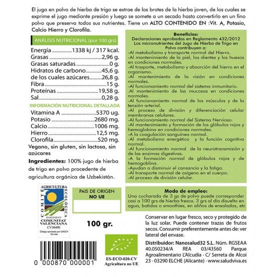 Toda la información sobre "Jugo de hierba de trigo en polvo ECO 100g, Salud Viva"